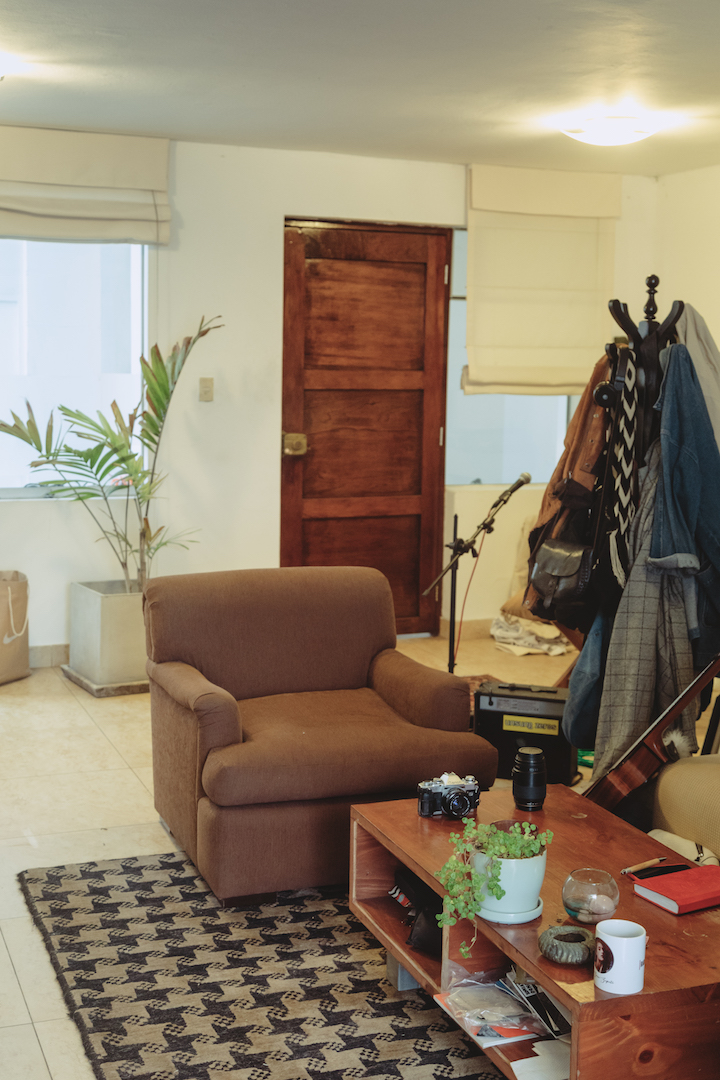 Nuria hace varias cosas a la vez porque hay poco que la satisfaga y se aburre rápidamente. Su piso se adapta a esa dinámica. Lo que podría ser el ingreso se ha convertido en una zona multiusos, donde ha colgado las repisas con materiales, guarda los bastidores, y borda y arma sus instalaciones; ese mismo espacio es el lugar donde toca con su banda cuando ensayan para alguna presentación de La Zorra Zapata, en esa silla se sienta a tocar la guitarra. A un lado, la mesa de trabajo sostiene el prototipo de su libro “más poético a la fecha”, Ejercicios de libertad.