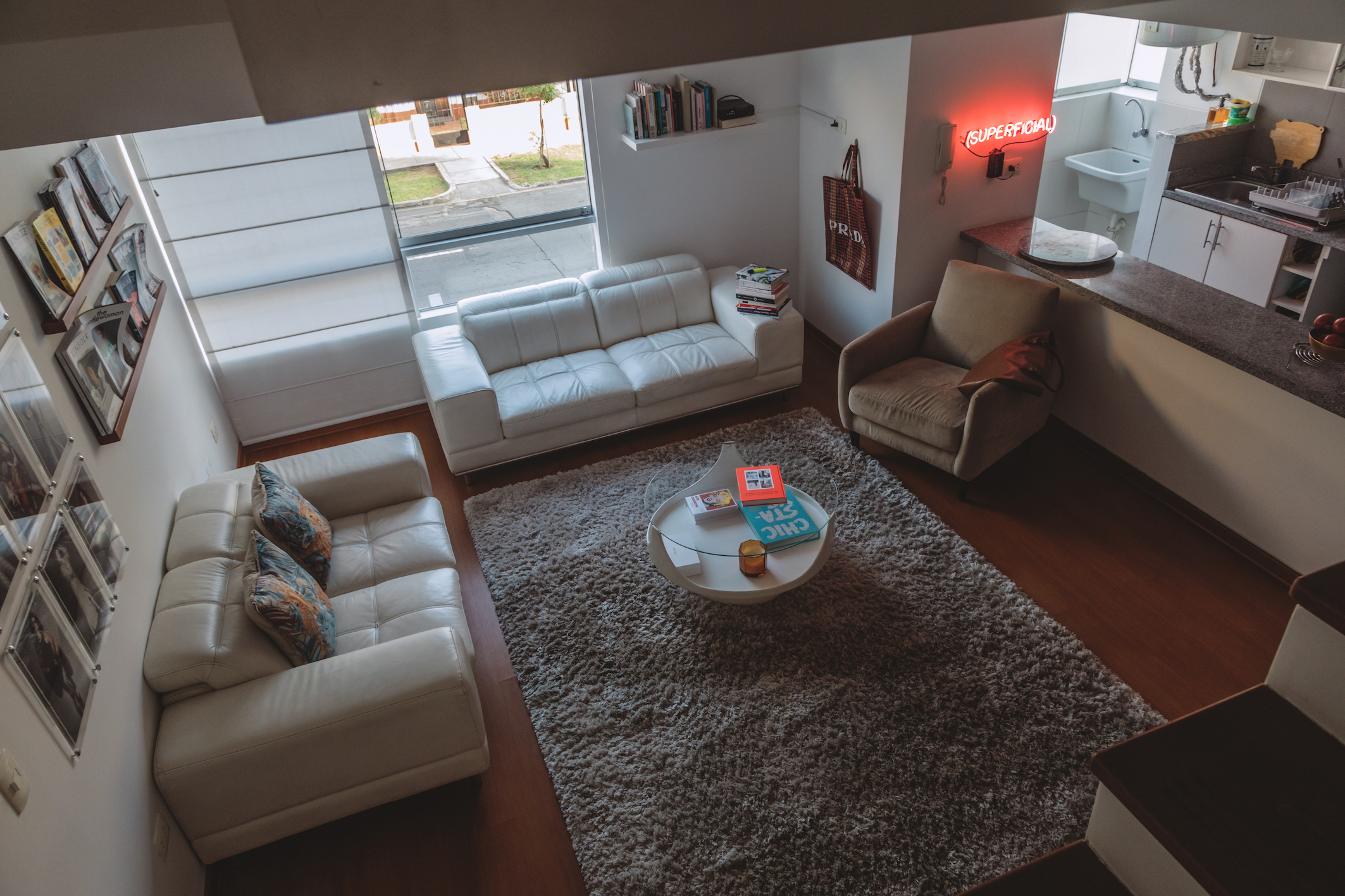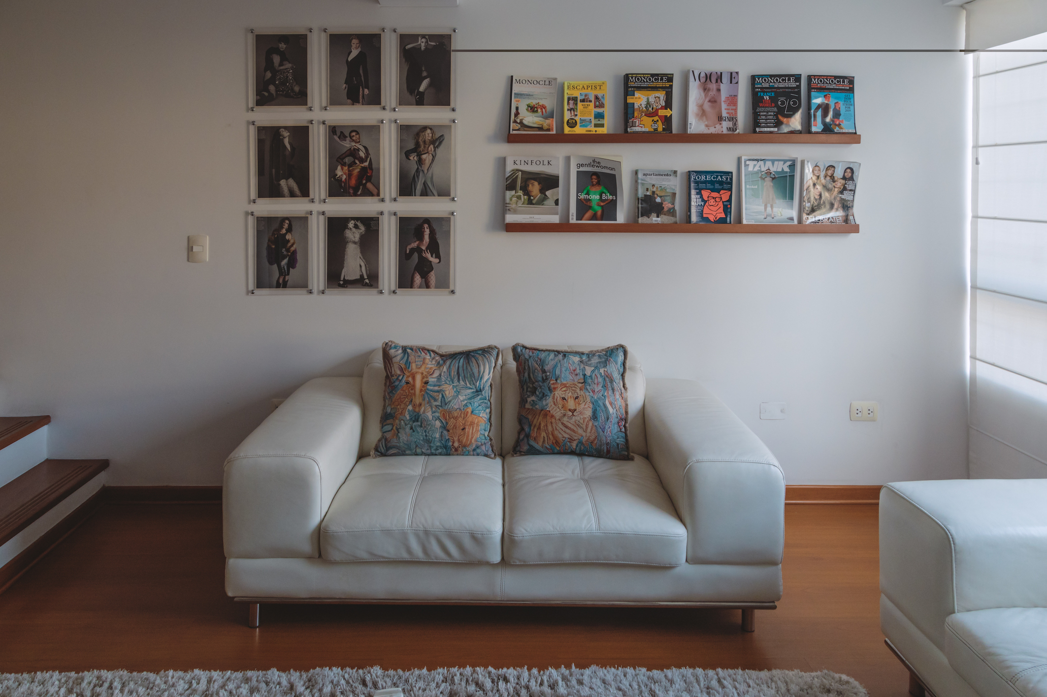 El mundo de los medios de comunicación le apasiona y las revistas ocupan un lugar protagónico en su departamento. En la pared principal de la sala ha puesto un revistero donde tiene los últimos números de sus favoritas, como Monocle, Apartamento, Kinfolk y Vogue. No tiene revistas apiladas, sino que se queda con el número vigente y las más antiguas las va regalando. “Uno tiene que compartir lo que le gusta”, dice.