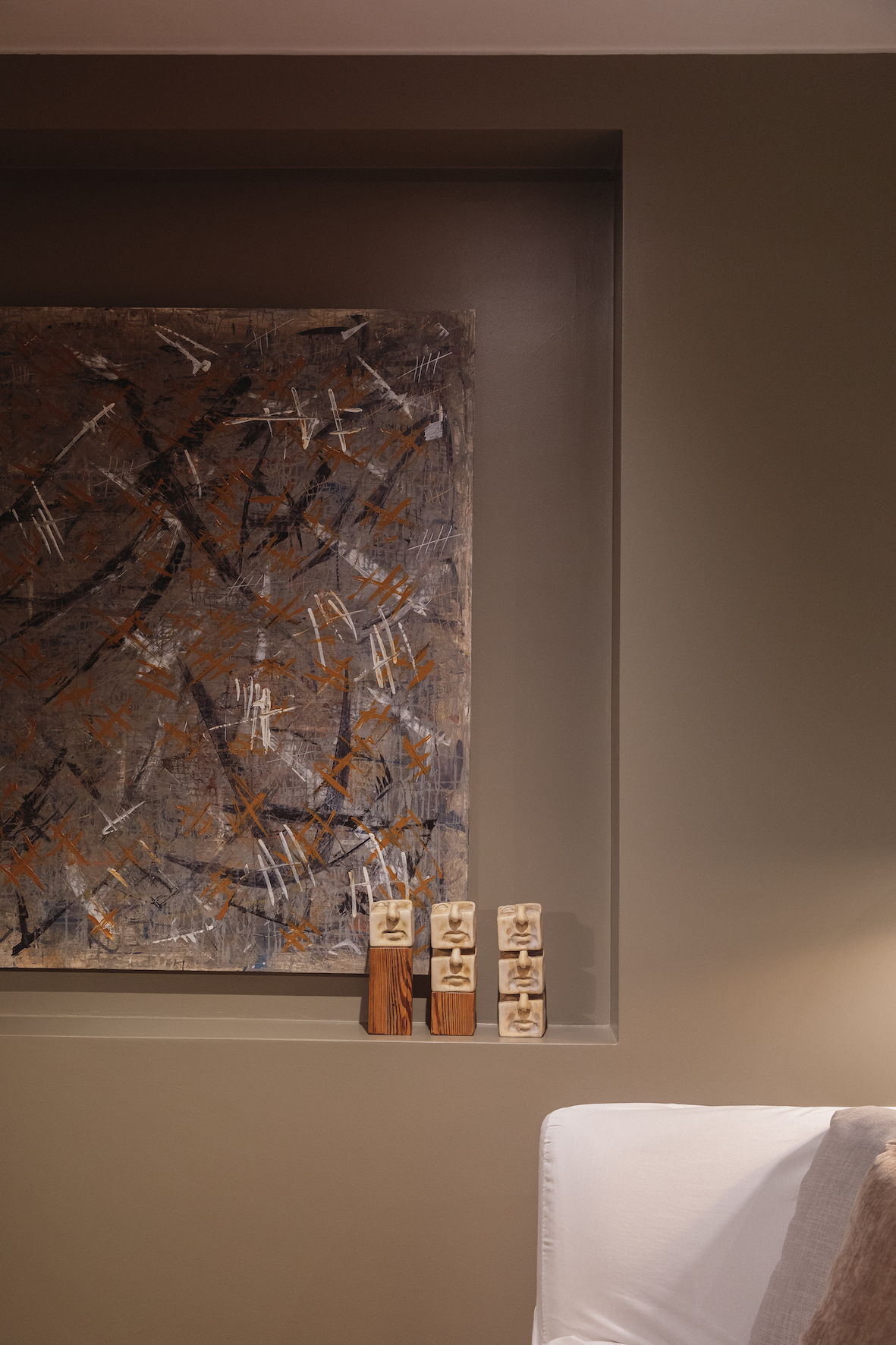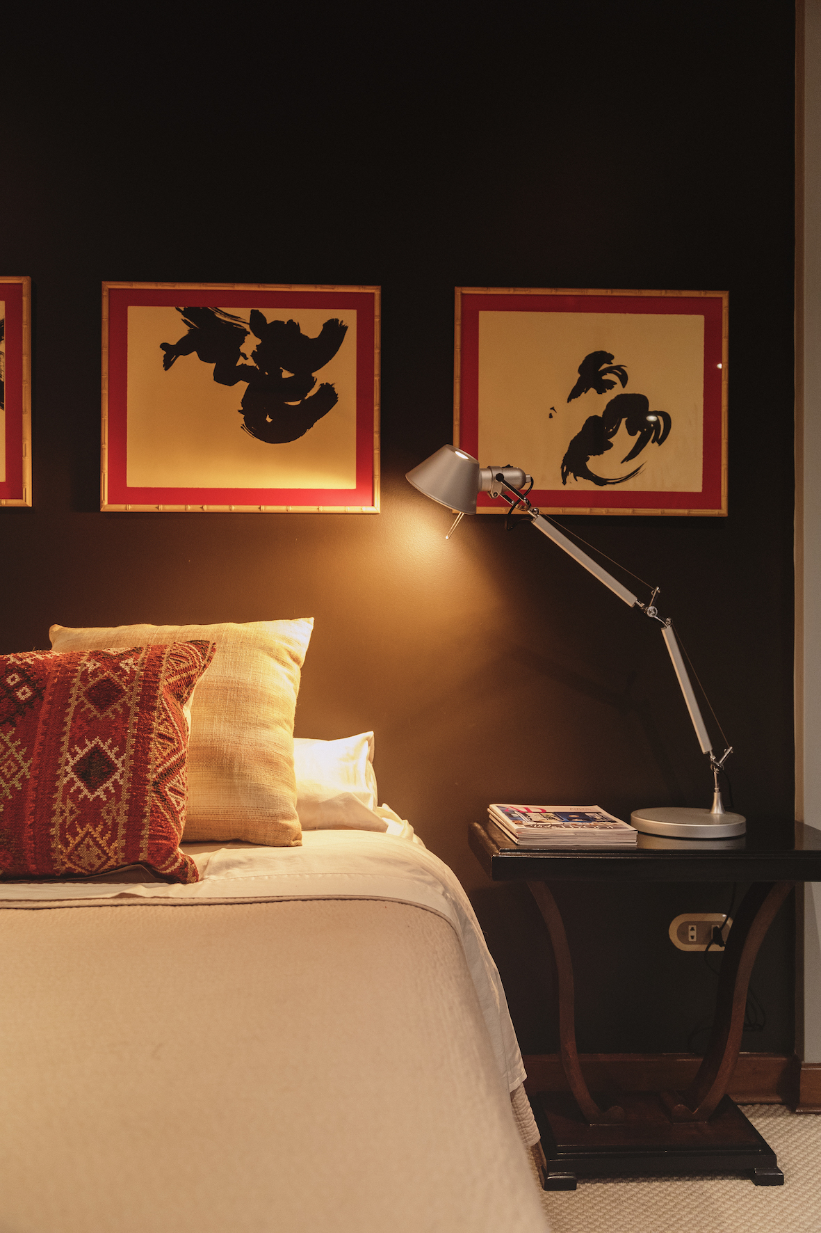 La vista desde el departamento que encontraron en San Isidro es, sin duda, una de las más lindas de Lima. Lo que Ignacio quiso fue mantener su identidad como argentino y a la vez “hacer un homenaje al Perú que me estaba recibiendo”. Por eso el arte es principalmente de autores argentinos y peruanos. Hay un interés por el territorio amazónico (una hermosa tela shipibo-coniba, pintada a mano, es la pieza principal del comedor) y hay una mirada a la herencia asiática. Pero también hay tonos neutrales porque ha percibido que el cliente peruano es más conservador que el argentino; sin embargo, no le faltan toques de humor.