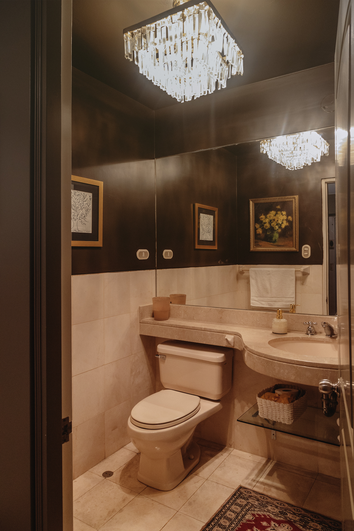 Estar en un departamento alquilado supone varios retos. No puedes tirar abajo paredes o sacar puertas ni muebles empotrados. Pero la experiencia le ha enseñado que con poco puedes lograr mucho. Por ejemplo, poner el colorido y divertido papel Missoni en la entrada cambió totalmente el espacio y le da una onda retro. En el baño de visitas, como no podía sacar las mayólicas, lo que hizo fue pintar las paredes y el techo de color chocolate y poner una lámpara linda y vistosa. Descifrar qué hacer con la cocina es aún un desafío.