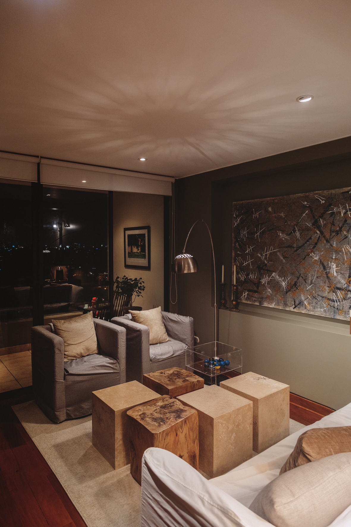 Propuso fotografiar el departamento de noche porque lo vive mucho así y la iluminación cumple un papel importante en el diseño. Tiene lámparas muy lindas y juega con una luz cálida. Ignacio come siempre en el comedor principal, no le gusta usar el de diario así coma solo. “Soy una persona formal dentro de todo, porque disfruto de las situaciones que se generan”, cuenta. “No tengo mucha vajilla -menos ahora- pero la que tengo es buena y la uso siempre. Creo que todo tiene que sentirse especial”. Ignacio escucha música en la sala (el living, como dice él), y también está mucho en el cuarto de la computadora, que es su oficina dentro de casa. Le gusta conocer personas nuevas e invitarlas a venir, se nota que es un excelente anfitrión.