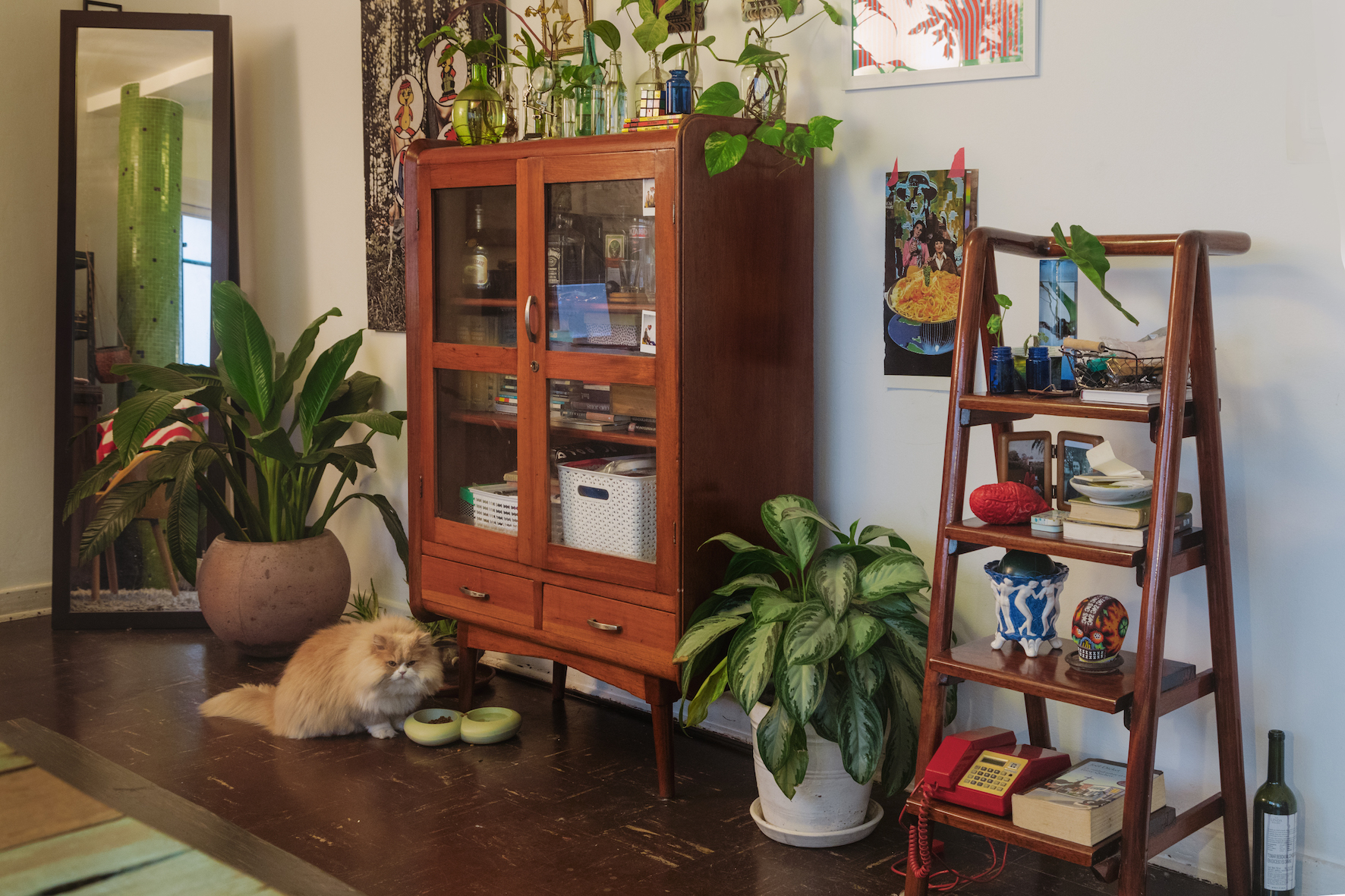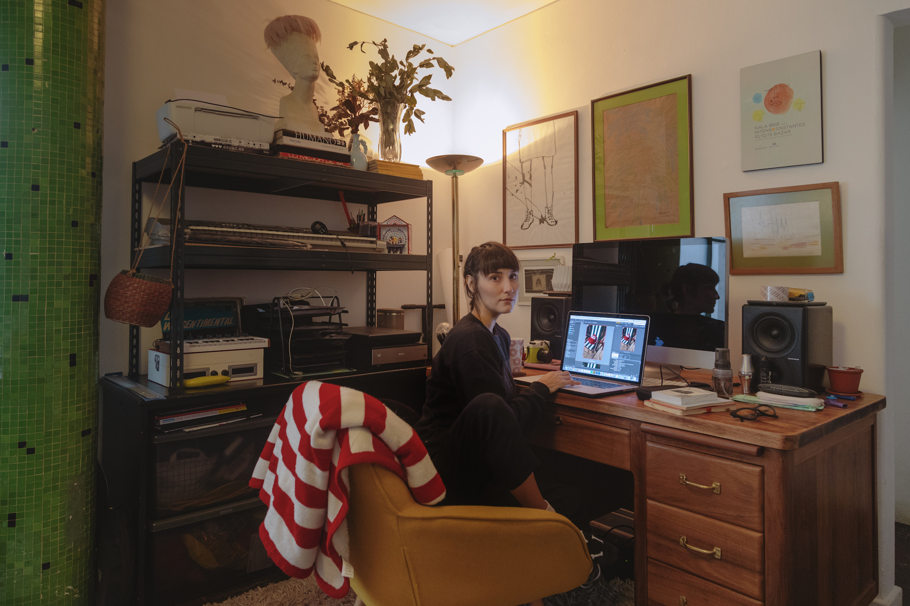 Hilda Melissa siempre pone mucho cuidado en armar sus espacios: sus casas, sus cuartos, sus estudios y hasta sus sets. Tiene una estética que es un poco retro -o ciertamente nostálgica-, pero que también se alimenta de referentes pop contemporáneos, y del juego y el humor. Todo eso está en su trabajo como fotógrafa, pero también en los colores y las formas con los que se rodea. Está pensando en cambiarse de dormitorio cuando Gabriela se vaya, porque el de Gaby tiene una ventana más grande y vista a la calle. Sin embargo, la ligera penumbra de su cuarto tiene más que ver con el mood de sus objetos, con sus muebles antiguos restaurados y con los colores pasteles y dusty que siempre usa. Junto a su cama tiene dos fotos chiquitas de sus padres: de su papi, que murió hace 5 años, y de su mamá, cuando era reina de belleza. Quizás debería quedarse en ese cuarto.