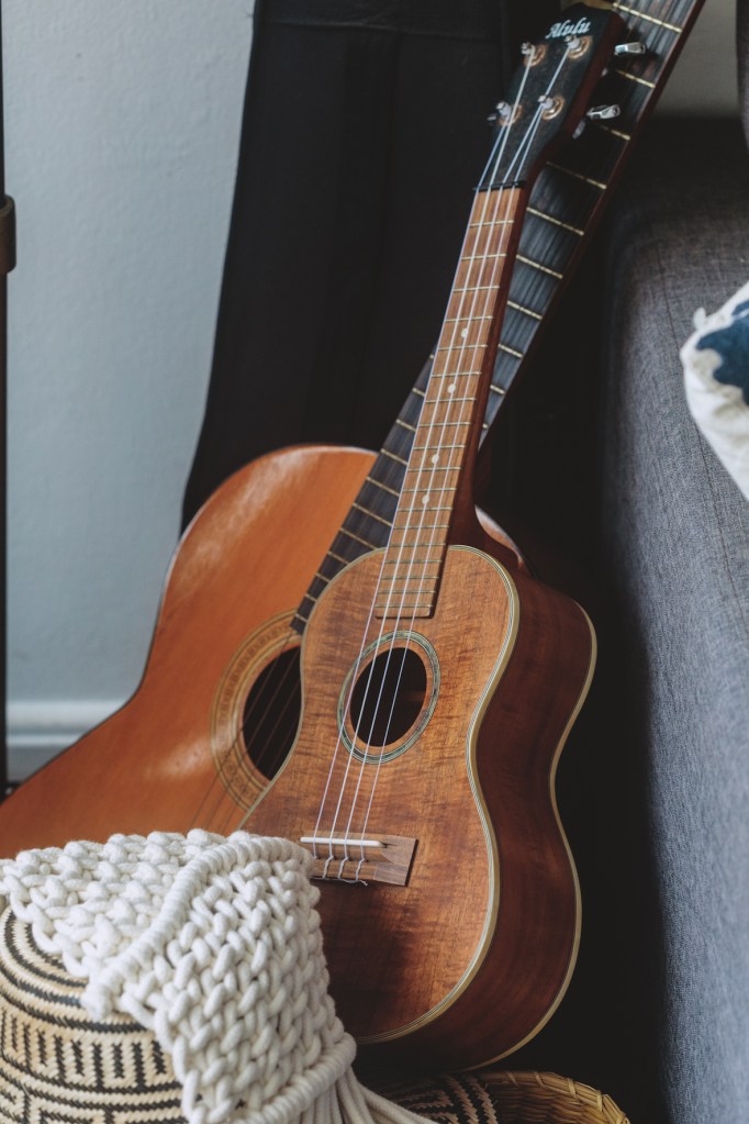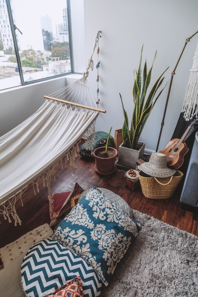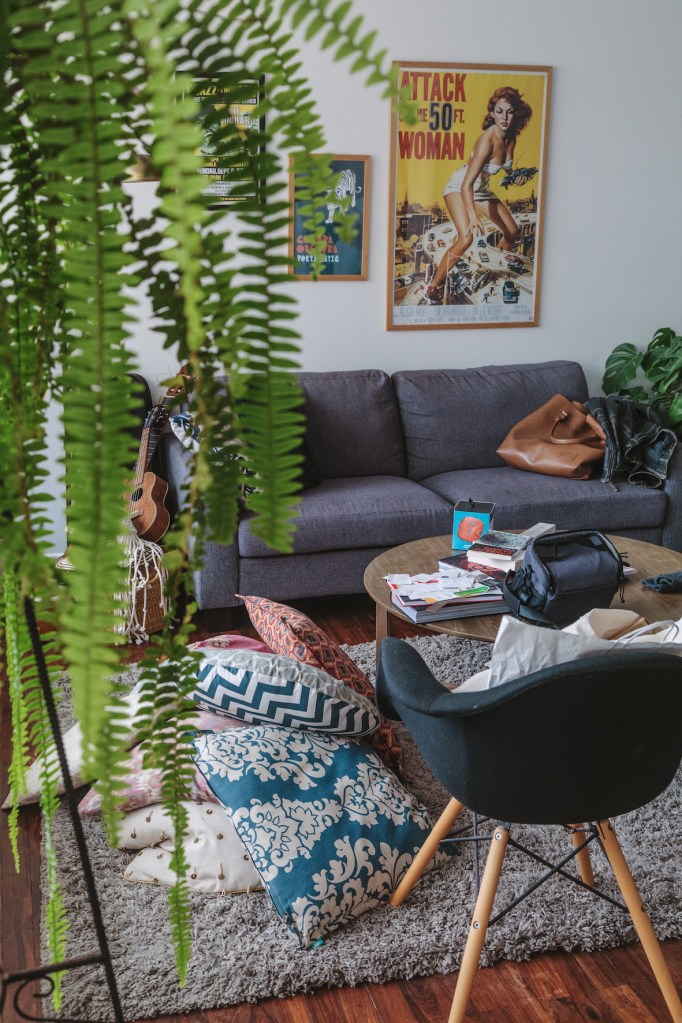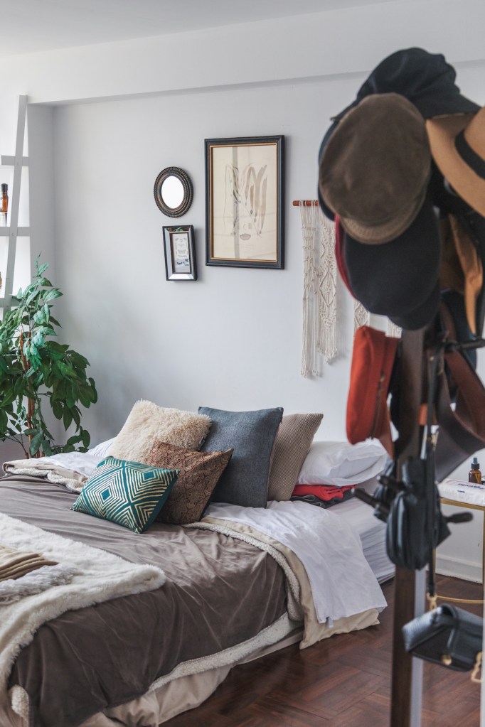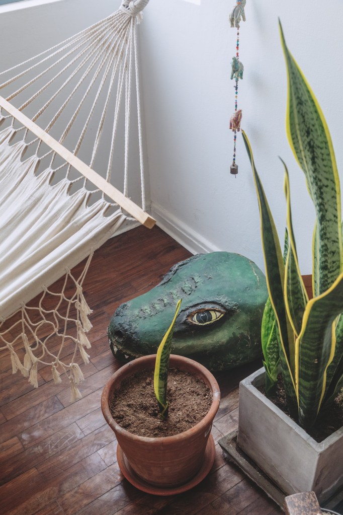 Una de las cosas que más le emocionaba de mudarse era poder decorar. El showroom de Camote Soup funciona en la casa de sus papás y sí ha podido pimpearlo un poco; pero su cuarto era tan chiquito y ella tiene tanta ropa y tantas cosas que no podía hacer mucho con el espacio así que “era supermonse”, admite. A Ale siempre se le relaciona con la moda, pero el diseño en un sentido más amplio es algo que siempre le ha interesado. Y ella encuentra que su manera de vestir y la forma en la que ha decorado el departamento tienen mucho que ver. “En general hay una onda relajada, tiene cosas bohemias [como la hamaca en medio de la sala, las guitarras como parte de la decoración, el crochet y los cojines sobre la alfombra], pero también tiene cosas antiguas y todo eso está mezclado con algo pop y retro, como mis pósters”, explica Ale. “Al vestirme yo siempre opto por ropa cómoda, y tienen que haber elementos modernos con otros más retro para que el look sea interesante. Me encanta mezclar”.