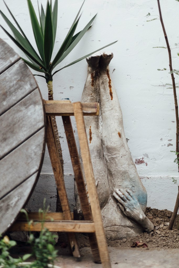 Encontró rastros de otros artistas y obviamente los ha dejado, como una ilustración de Amadeo Gonzáles hecha en una caja de luz, o la escultura de Claudia Salem semienterrada en el patio. Alguien dejó un cajón de madera que seguramente se usaba para transportar piezas pesadas y Aileen lo convirtió en la mesa de la sala. Tiene la idea de arreglar la entada lateral que va directamente al patio, de tal forma que la gente pueda llegar al taller sin tener que atravesar toda la casa. También están preparando un minihuerto, la zona de compost y un punto de reciclaje.