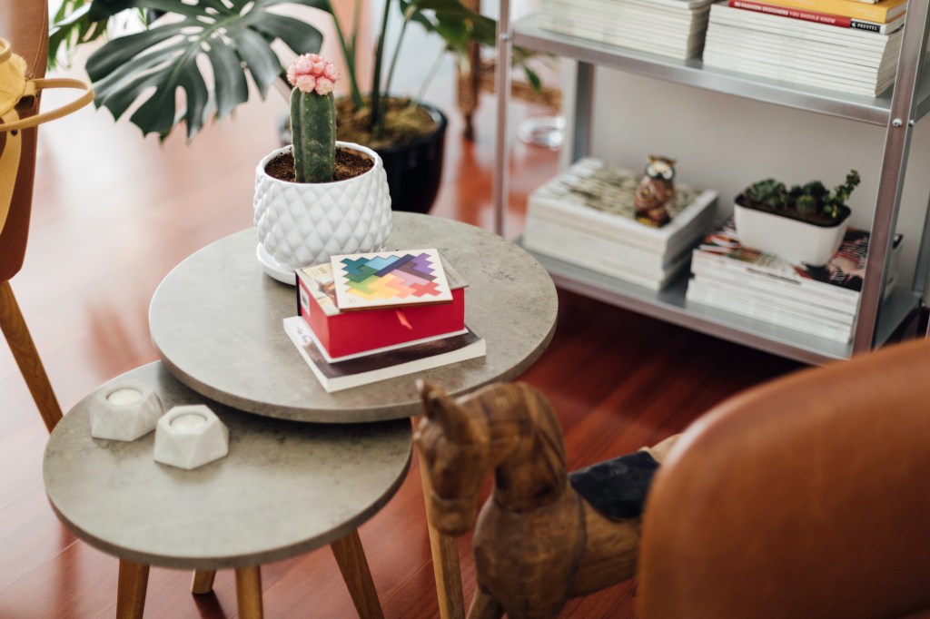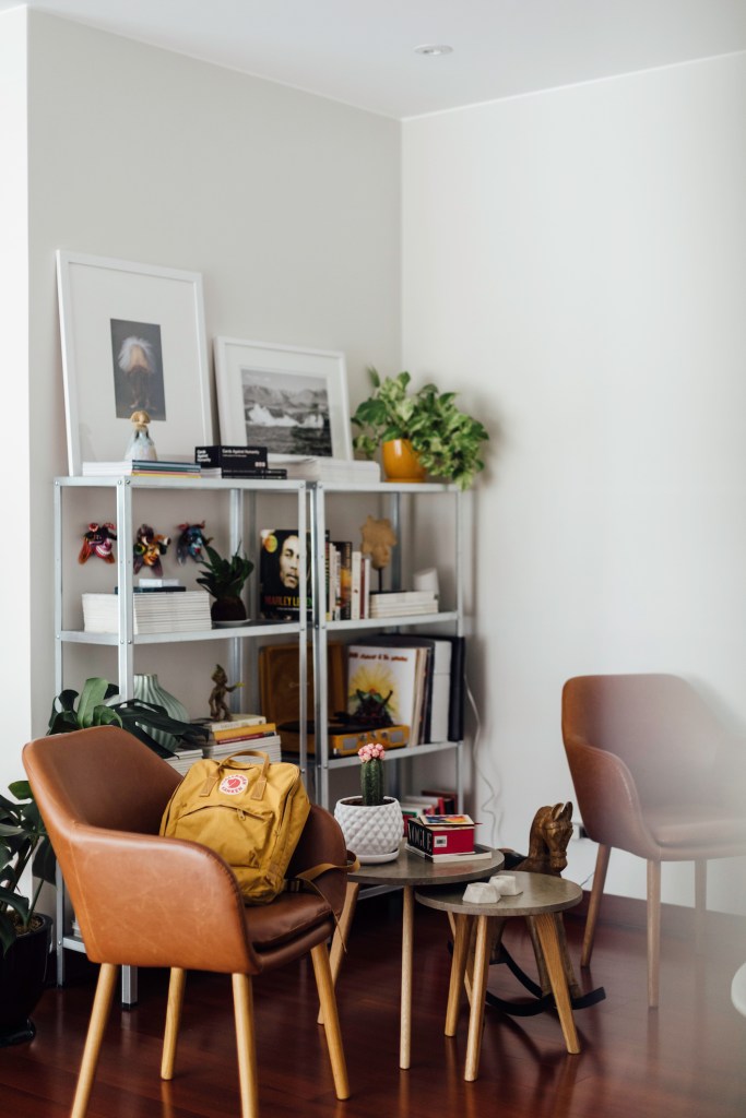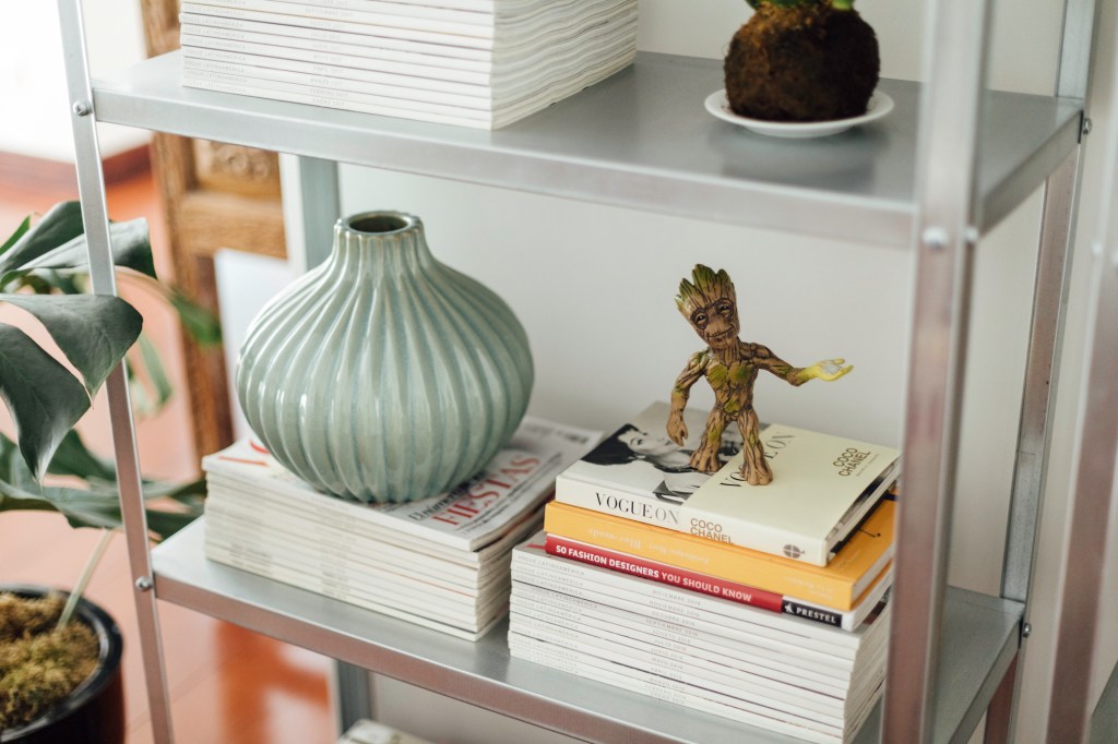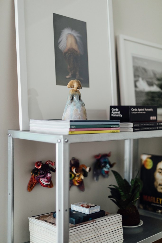 En la casa de sus papás no podía hacer mucho y en el depa de Jose estuvieron muy poco tiempo como para decorarlo bien, o sea que en este depa es donde ha podido poner en práctica ideas de diseño que ha tenido desde siempre. Por ejemplo, su librero soñado. Romina fue coordinadora editorial de Vogue en el Perú durante 3 años, por lo tanto, su colección de revistas es gigante; por otro lado, tiene muchísimos libros. Hoy por fin puede lucir una selección en su sala, entre adornos y piezas de arte que han ido recolectando. “Desde que llegamos aquí hemos ido implementando el espacio. Todas las semanas hay algo nuevo”, cuenta.