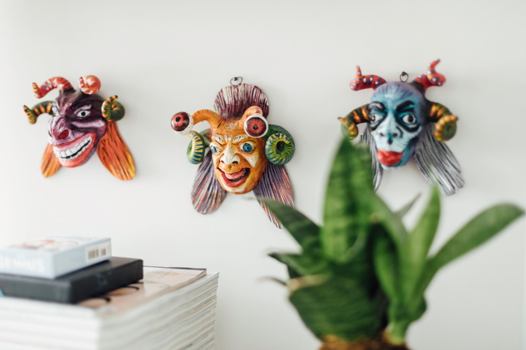 Jose también le ha ido agarrando el gusto a las artesanías y las antigüedades. Hace años se trajeron unas máscaras de Ayacucho que tenían guardadas, y aquí las han podido colgar en el librero; en La Cachina de Surquillo acaban de encontrar un bar antiguo que tiene una marquetería muy bonita. A Romina le encanta rescatar antigüedades y renovarlas, pero lo que más le gusta es encontrar esos objetos que hacen su casa diferente a otras.