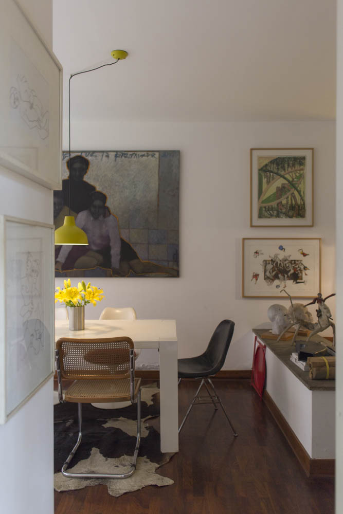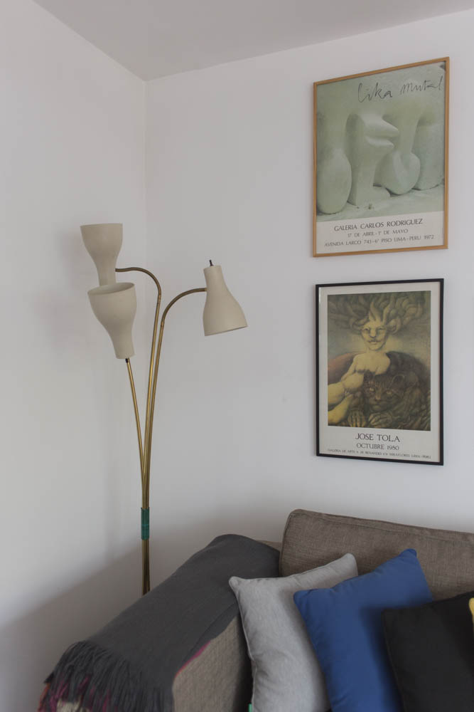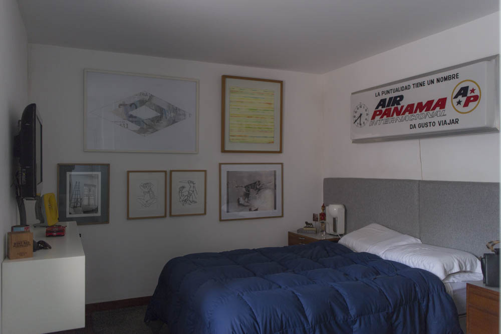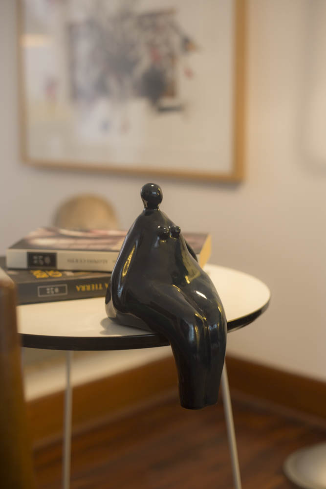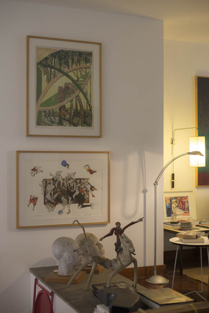 Y si los muebles tan curados hacen mucho por definir la atmósfera de su depa, el arte termina de darle forma. Sergio es amigo de muchos artistas, curadores y fotógrafos. “Eso que conoces a una persona y luego conoces a un montón”, explica. Tiene muchas piezas de su tío Bruno, incluso algunas que él tenía casi perdidas en el taller y que Sergio rescató; también tiene obra de artistas amigos de Bruno, quienes le agarraron cariño y le regalaron cosas, como de Elda Di Malio, Moiko Yaker y Nader Barhumi. Pero muy pronto Sergio empezó su propia colección, compraba arte cuando ninguno de sus amigos lo hacía, y tiene pinturas, dibujos y grabados de artistas como Fernando Otero, Daphne Dougall y Mariella Agois. Además, tiene posters de exposiciones a las que fue, que guardó y luego mandó a enmarcar.