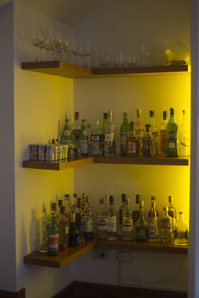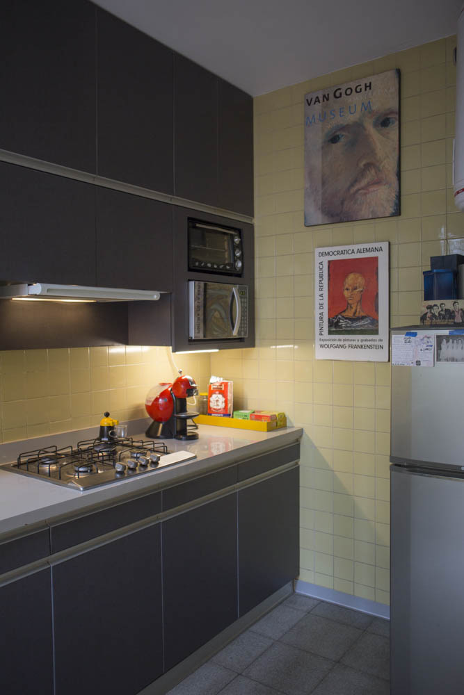 Remodeló por completo la cocina e hizo pulir todo el piso de madera, además de pintar el depa. El lugar tiene una onda retro muy especial: el ingreso tiene la calidez del ladrillo y de las plantas, y ya dentro del departamento hay desniveles, el comedor está una grada por debajo de la sala y eso hace que gane altura de piso a techo. Tiene un jardín pequeño pero lo suficientemente grande como para tener una parrilla. La esquina de la sala se convirtió en el bar expuesto y arriba Sergio adaptó el dormitorio principal como salita de televisión. Lo ha llenado todo de muebles antiguos, recuperados, y de arte. Aquí ha podido encontrar lugar para todo lo que ama.
