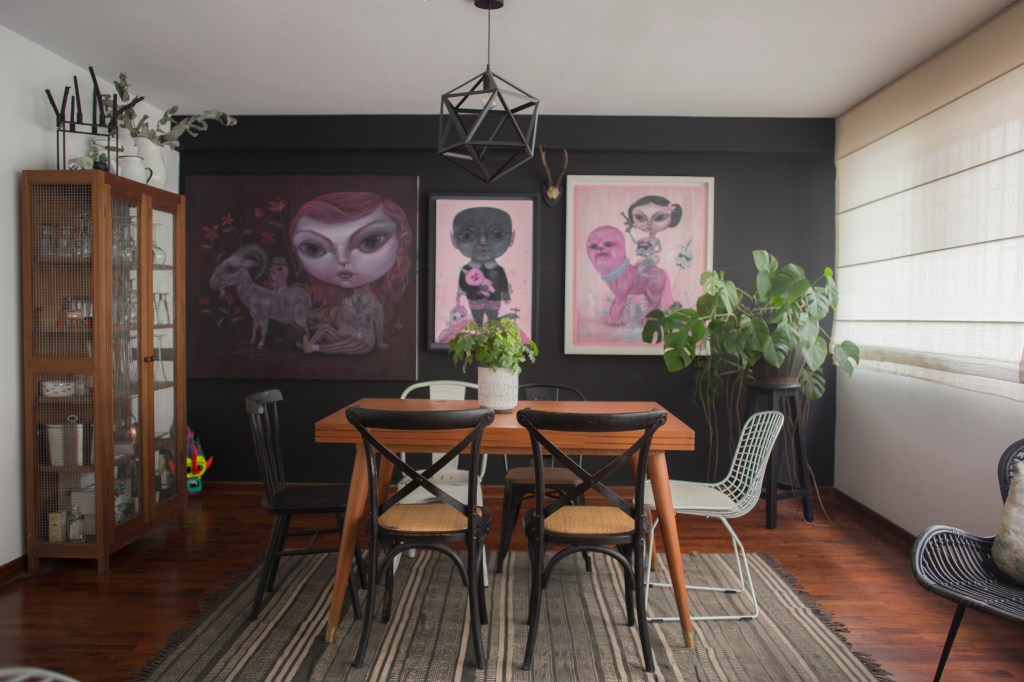 “Cuando comencé tenía un estilo más de tattoo, más calaveras, era inmaduro en el contexto y en el acabado de mis cuadros. Mis obras eran más desprolijas y quizás por eso era tan fácil desligarme de ellas. En los últimos años me he dado cuenta de que tengo un mejor trazo para tener una obra que perdure en una casa, por eso ahora soy más consciente de tener obras mías en mi espacio”.