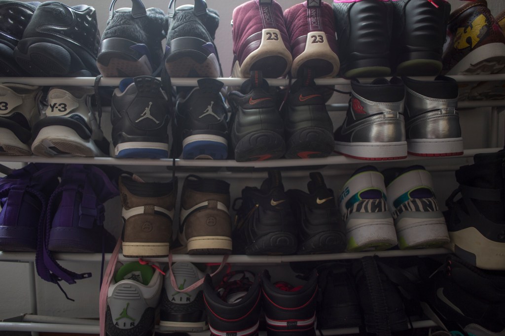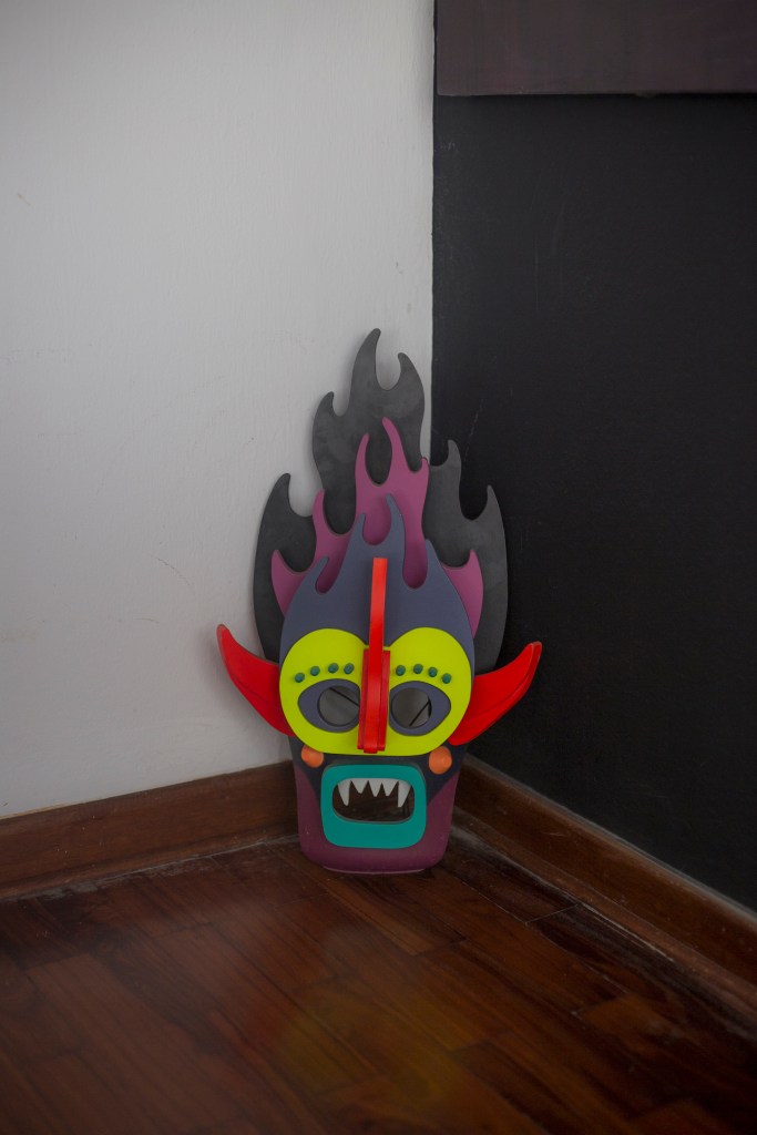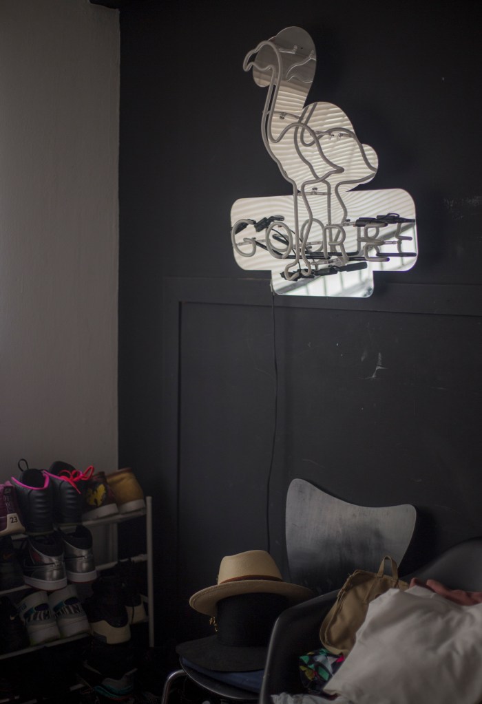 Es desordenado para pintar, tanto en su entorno como en su proceso, Conrad Florez lo admite: a pesar de eso –parece una contradicción–, es metódico en lo que a tratar de ahorrar se refiere: en el material, en el espacio. No necesita desperdigarse, abarcarlo todo. Trata de ser compacto. Tanto si va a pintar un cuadro como si va a acometer un gran mural, el artista compra el material medido, solo lo necesario, y procura que todo quepa en una mochila, para chapar esa mochila e irse a pintar. Por eso nunca le funcionó tener un taller independiente: siempre pintó en su casa. “Cuando era chibolo y comencé a tener sponsors y me auspiciaba una marca de zapatillas era chévere tener tantas, pero luego te pasas de vueltas… ¿Qué haces con tanto que no usas? Entonces lo mejor es quedarte con lo que sea necesario y despojarte de lo innecesario. Lo mismo es con mi trabajo”, explica Conrad. “Lo que necesito es tener un espacio que sea agradable para vivir y a la vez para trabajar”.
