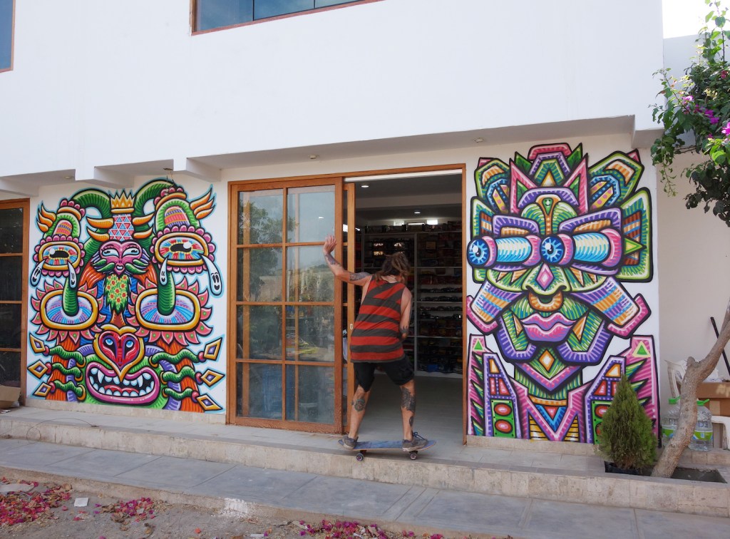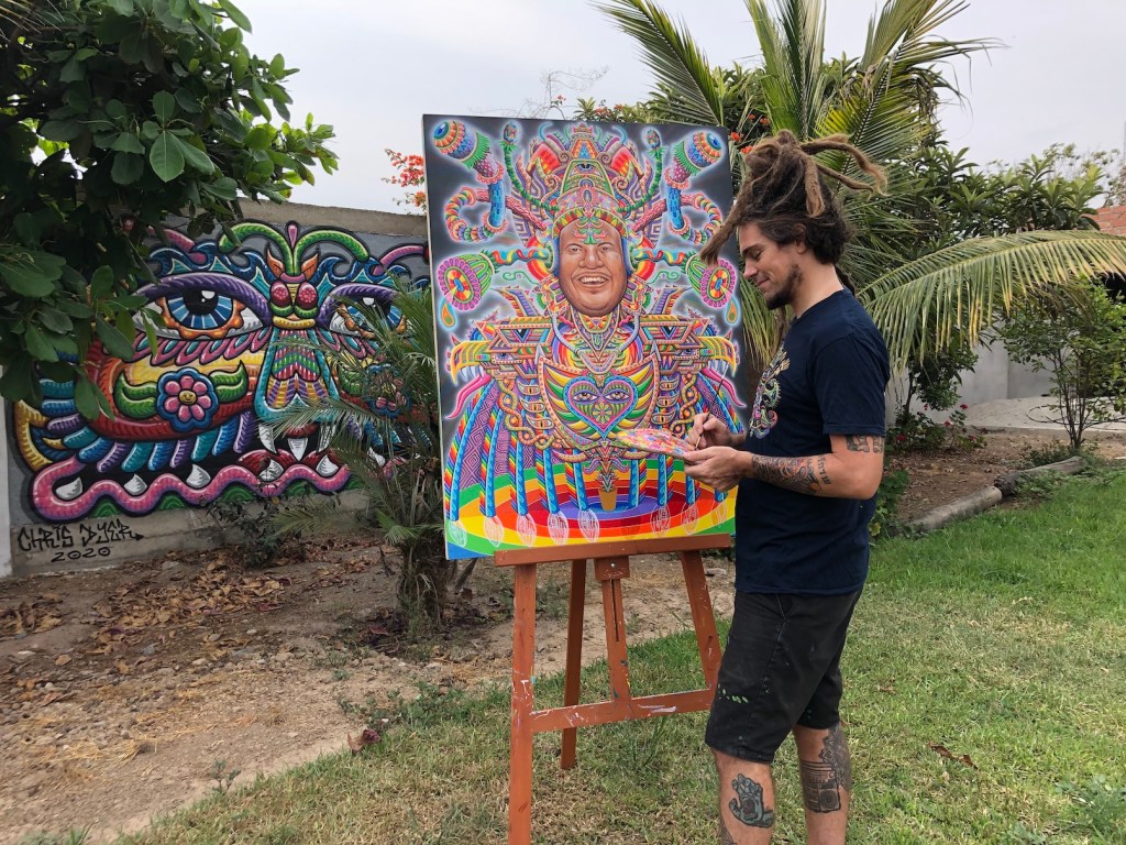 Chris pasa sus días en la chacra y en el jardín, y haciendo quehaceres de la casa, con sus padres. También montando algo de skate. Y, por supuesto, pintando mucho. Chris Dyer es muy bien considerado en la escena internacional del arte urbano y del llamado “skate art”. Su enfoque energético también puede ubicarse dentro del arte visionario, que tiene reminiscencias sicodélicas y un trasfondo espiritual. Todo lo que hace –sus cuadros, murales, sus exposiciones, hasta los objetos que vende con su marca Positive Creations, e incluso los talleres que dicta, como el de Tarapoto– se encuentra dentro de un concepto de espiritualidad positiva a través del arte, la creación y la sanación, y de la intención de hacer un mundo mejor.
