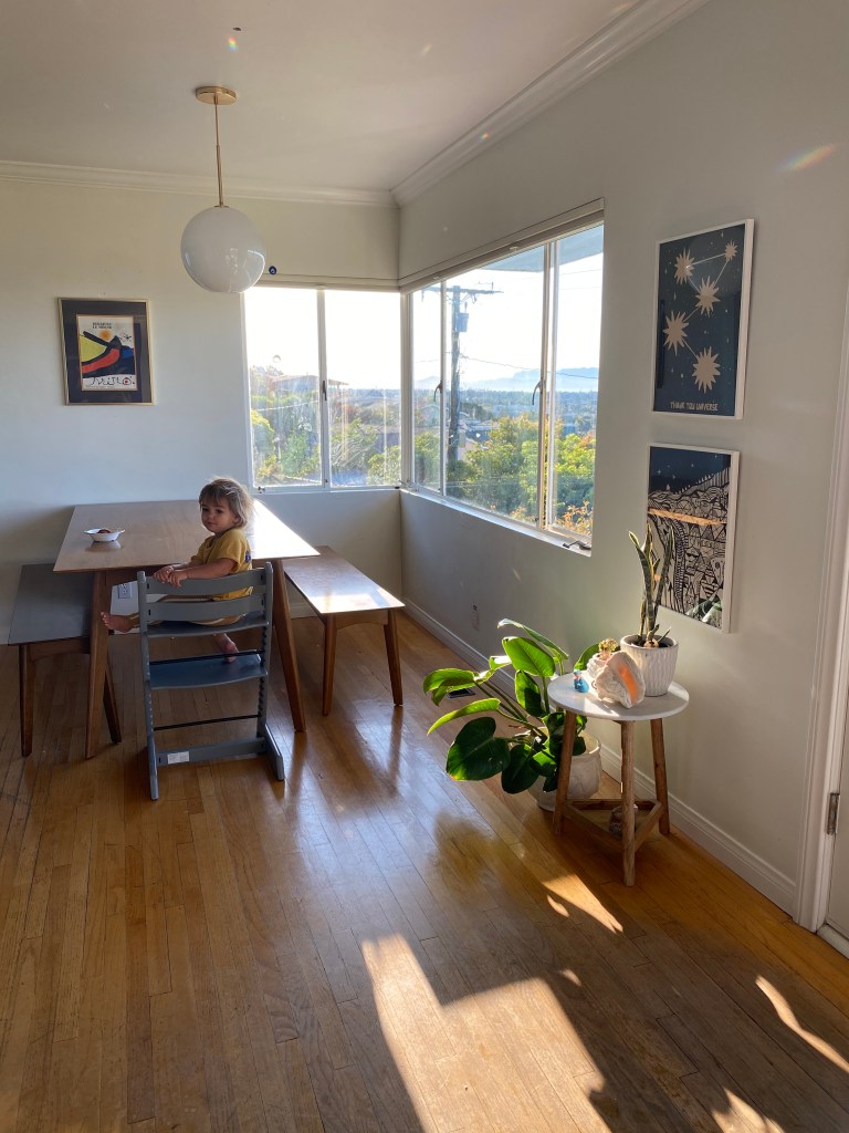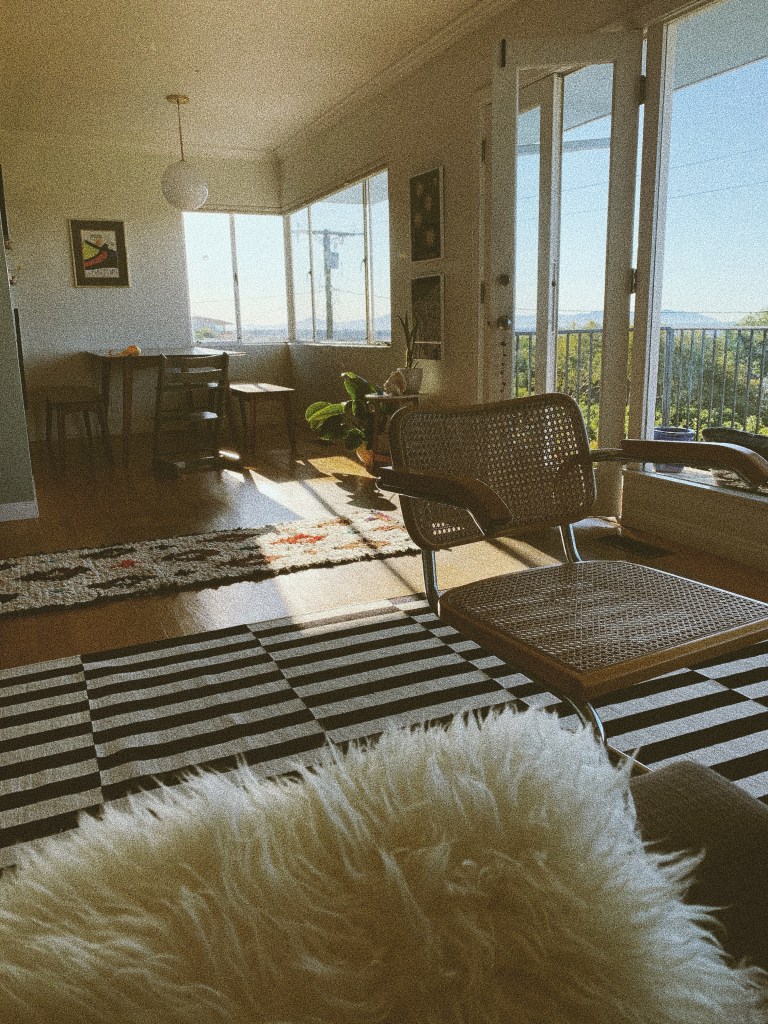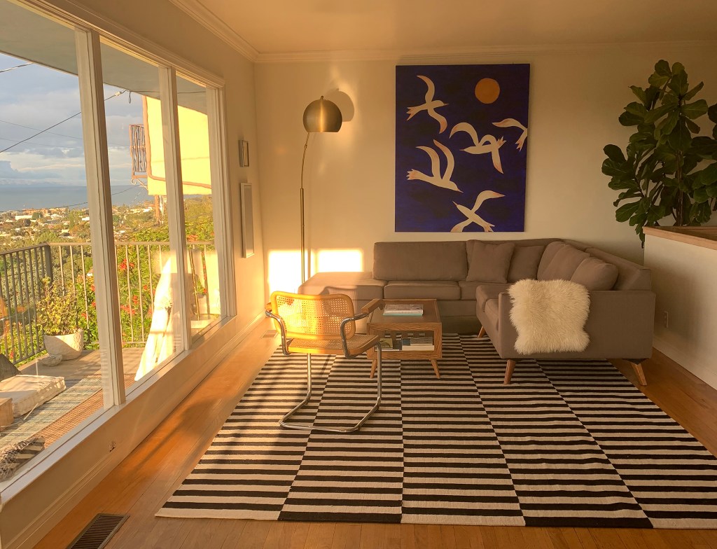 Daniella se enamoró de esta casa de los años cincuenta. Cuando llegaron aquí ya eran cuatro, con su hija Mila que hoy está a punto de cumplir dos años. El año pasado aceptó un trabajo a tiempo completo como diseñadora de textiles en Patagonia (diseña las telas para las colecciones de niños y de swimwear), y por eso en los últimos meses no ha pasado tanto tiempo en casa. Aún hay cosas que le falta arreglar, como el jardín. Pero la luz maravillosa que entra por las ventanas y las mamparas es su guía para decorar. Ha conseguido muchos muebles y lámparas de estilo mid century modern, que le encanta, y que resalta el espíritu retro de la propiedad. Lo único que no le gustaba es que la casa, por fuera, es celeste. Pero no hubo oportunidad de cambiar el color y la verdad es que ya le agarró el gusto.