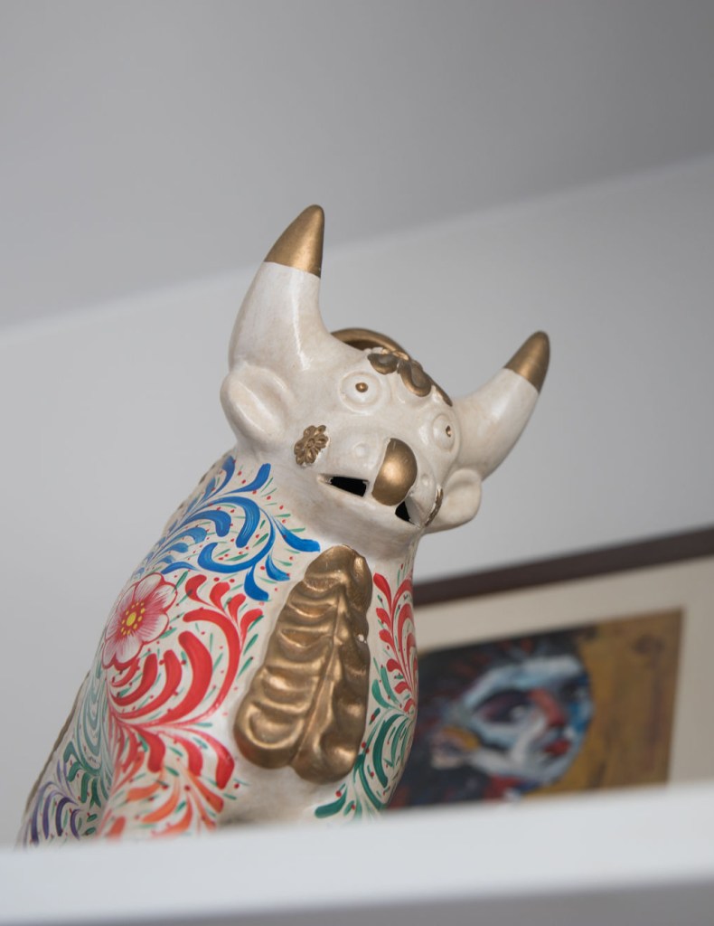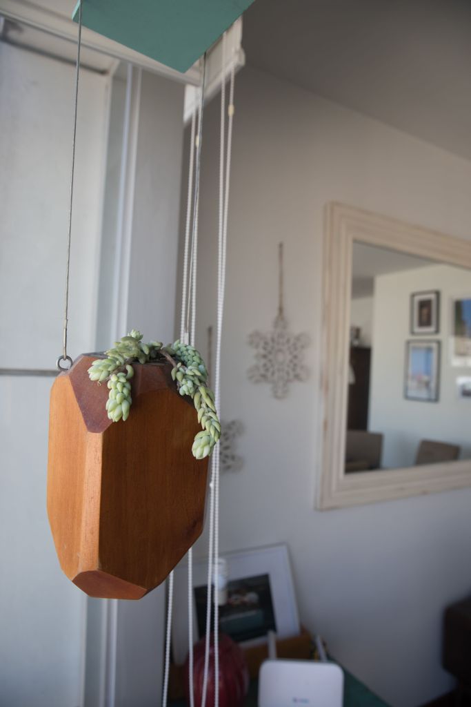 Siempre le gustó la decoración. “Ahora también me importa, pero no tengo plata, hay otras prioridades”, se ríe. Le encanta comprar adornos y tiene muchos, siempre que puede compra cosas baratas pero bonitas. No es nada minimalista, le encantan los ambientes con detalles. Sus objetos favoritos son los que encierran un recuerdo, los conserva incluso si están rotos o viejos. Su departamento es alegre, con elementos rústicos (como el adorno tejido de pared y la caja de madera como maceta colgante), y la pieza central es, sin duda, su gran cuadro de “Love Is The Answer”: un mural que Conrad Flores pintó durante su boda. Tiene mucho significado.