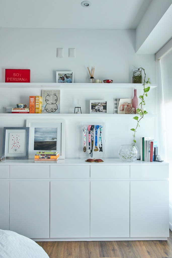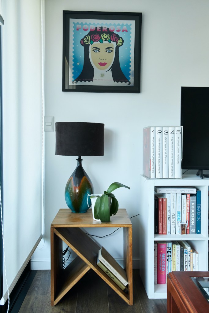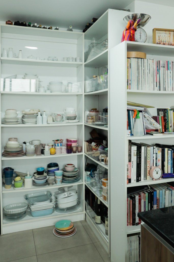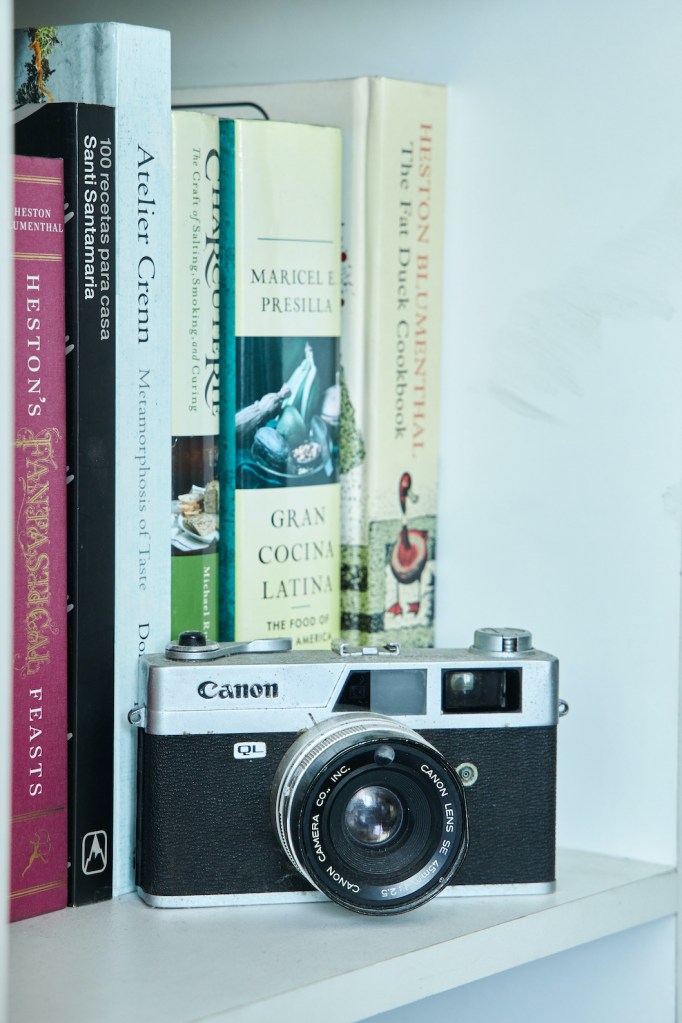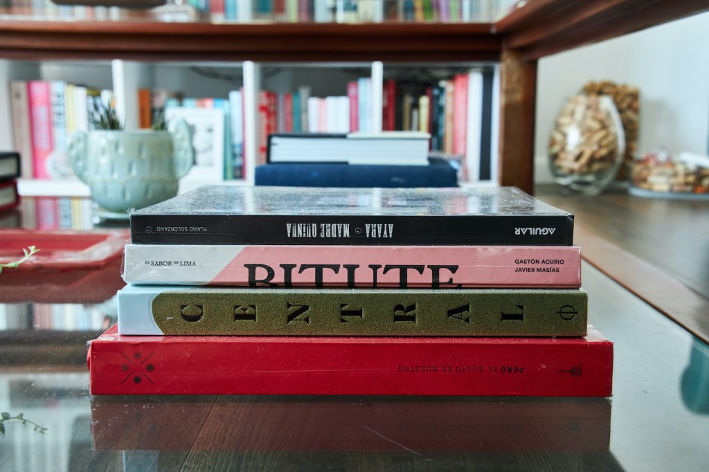 En sus anteriores departamentos tuvo que instalar su estudio fotográfico adaptando el comedor o ganando espacio a la sala. Pero antes de mudarse al depa nuevo ya había trasladado el estudio a un espacio chiquito que comparte con la diseñadora Paloma Nieri. Ahí tiene una cocina –que ella misma remodeló– en la que prepara los platos que luego fotografía. También guarda los cientos de piezas de las vajillas y los accesorios que usa para sus fotos, y que ocupaban demasiado espacio en su casa. Gran parte de esas piezas, así como sus libros de cocina, se los trajo desde España. La experiencia acumulada valía más que todos esos kilos extra que tuvieron que pagar al momento de volver.