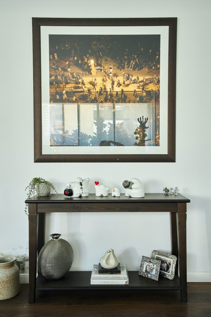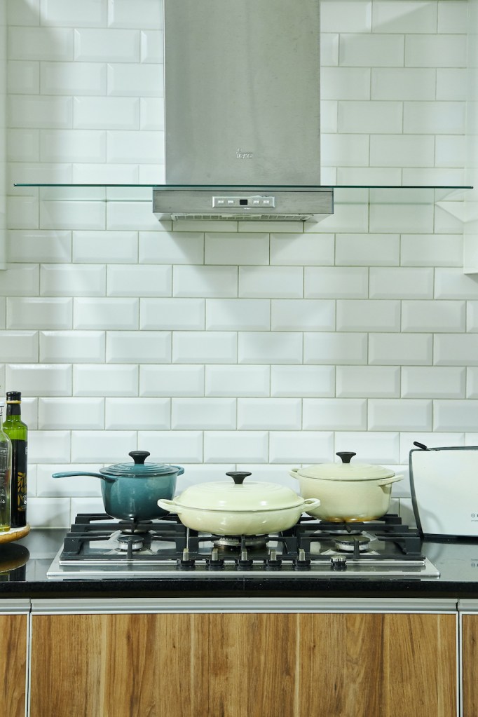 Jimena no escogió el depa por la cocina, pero sí que notó lo linda y espaciosa que era. Tiene una isla grande y la utilizan un montón. Ahora que la fotógrafa ha vuelto a trabajar en casa, se pasa buena parte del día en la cocina, y los chicos muchas veces llevan sus cuadernos y se sientan con ella para acompañarla. Ha sacado todo lo que generalmente está guardado: el procesador, la licuadora, las ollas de fierro fundido (las coleccionan en distintos colores). Ya no guarda nada en los cajones, todo se ha quedado afuera, a la mano.