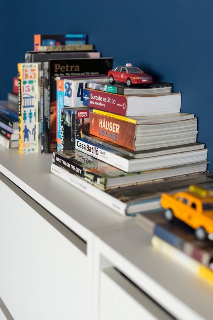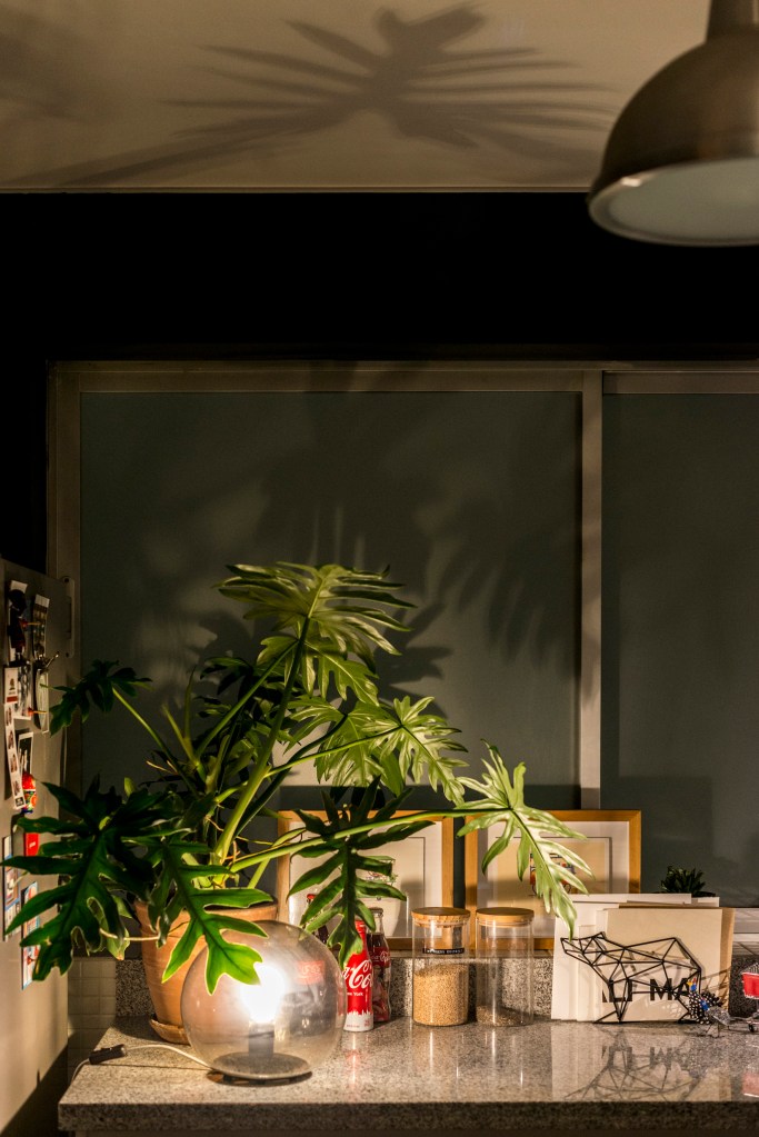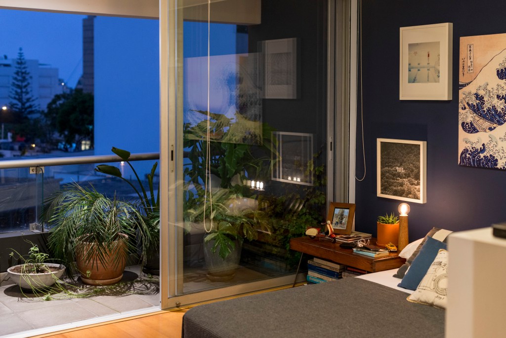 Lo conocía porque aquí vivían unos amigos suyos; cuando se mudaron, le traspasaron el alquiler. La zona le gustó porque puede hacerse todo caminando, tiene cafés, tiendas y restaurantes cerca. Lo primero que hizo fue pintar el área social y los pasillos del departamento de un gris oscuro, y su dormitorio de azul. Para Renzo es un mito que la pintura achica los ambientes; por el contrario, a él le parece que les da más profundidad y los hace acogedores. Piensa que poner una planta, un cuadro y dejar la pared blanca no es suficiente, y que muchas veces se opta por eso por miedo a que hacer algo más (algo diferente) al final no se vea bien. También está el hecho de que cuando se vive en un lugar alquilado se procura no pintar mucho ni hacer muchos huecos, ya que al final hay que devolverlo tal cual. Pero para Renzo eso no tiene sentido: así sea solo por un tiempo, ese espacio será tu hogar, y tienes que adaptarlo a ti, tiene que gustarte y serte cómodo todo el tiempo que lo vivas.