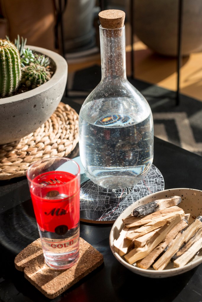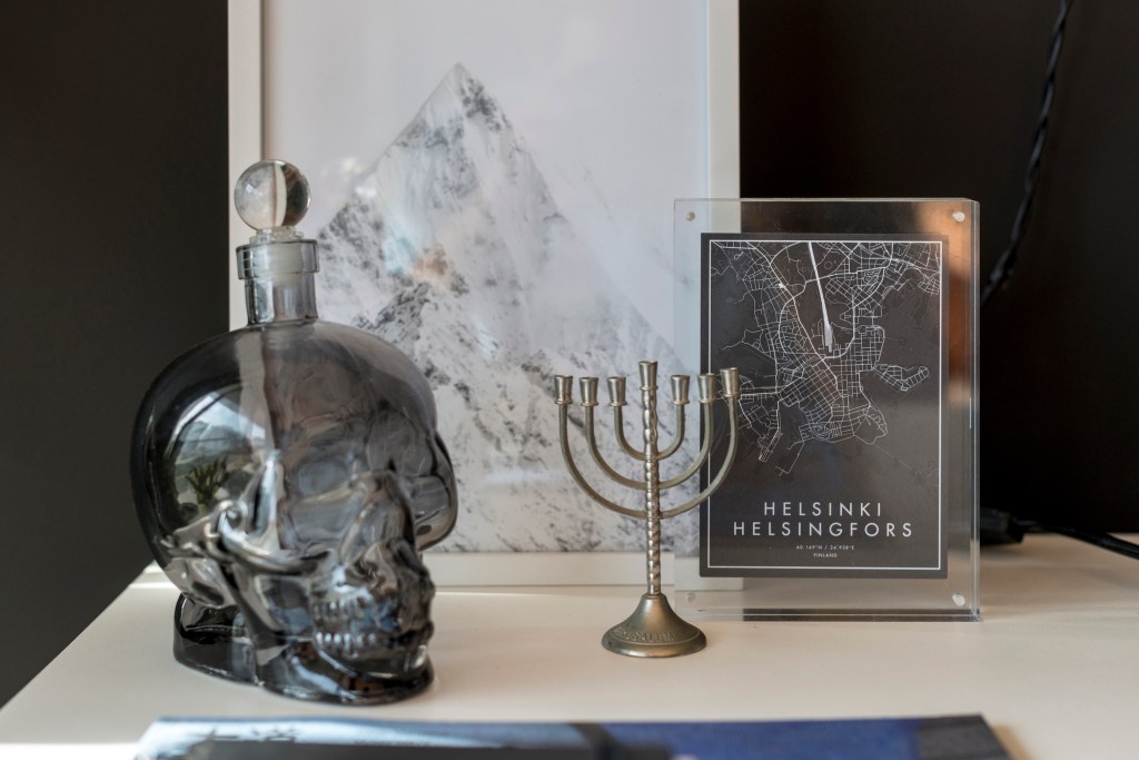 En su colección de objetos curiosos también está una quijada de burro, cerámica de Vietnam, un tambor que compró en Tanzania y un sombrero tailandés. Tiene una menorá de Israel y varias calaveras típicas mexicanas. También un neón divertido que le compró a un amigo, que ya no lo quería. Usa un locker de metal a manera de bar. Durante todo este tiempo tomando fotos de espacios pensados por arquitectos y diseñados por decoradores, fue guardando ideas, recopilándolas en su mente.