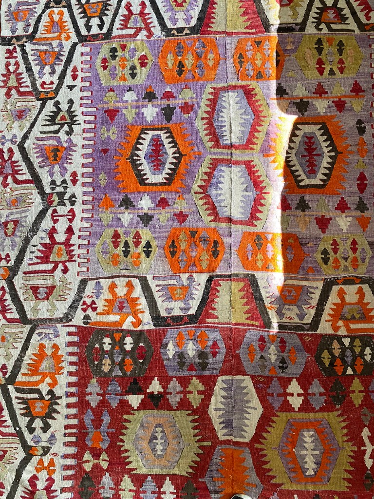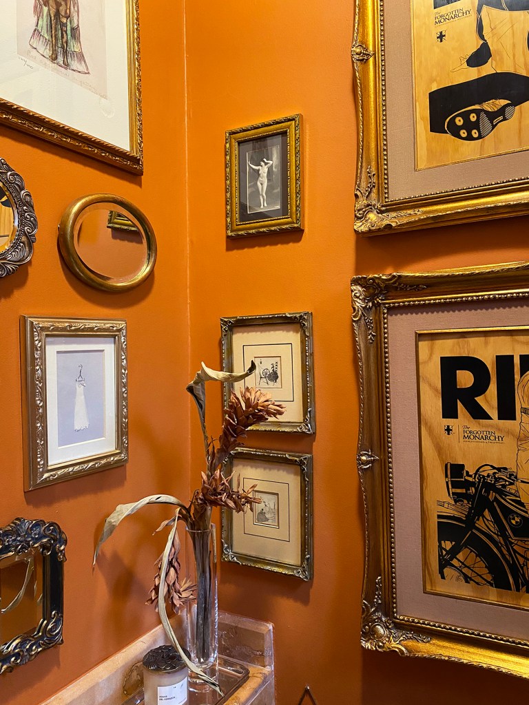 La sala es el corazón vibrante de la casa. Compraron un sofá antiguo en un mercado de pulgas, lo rescataron y retapizaron con terciopelo verde; el mueble rosa lo mandaron a hacer, junto con los cojines redondos de estilo retro. Las alfombras de Medio Oriente y los kilim los han ido juntando. Sandra es atrevida pero se da la oportunidad de recular, como le pasó con el color rosa pálido con el que había pintado inicialmente el salón, que luego se convirtió en un melón que ha encendido el ambiente. Como el techo es bajo y por momentos no entra mucha luz, pusieron el espejo grande para que maximice todo. La mesa de centro es de una sola pieza de madera y la diseñó Santiago. Hace mucho frío aquí abajo porque el ambiente de al patio, pero la chimenea funciona y en el invierno la viven mucho. Por las noches, poner la leña y sentarse en las butacas frente al fuego es un plansazo.