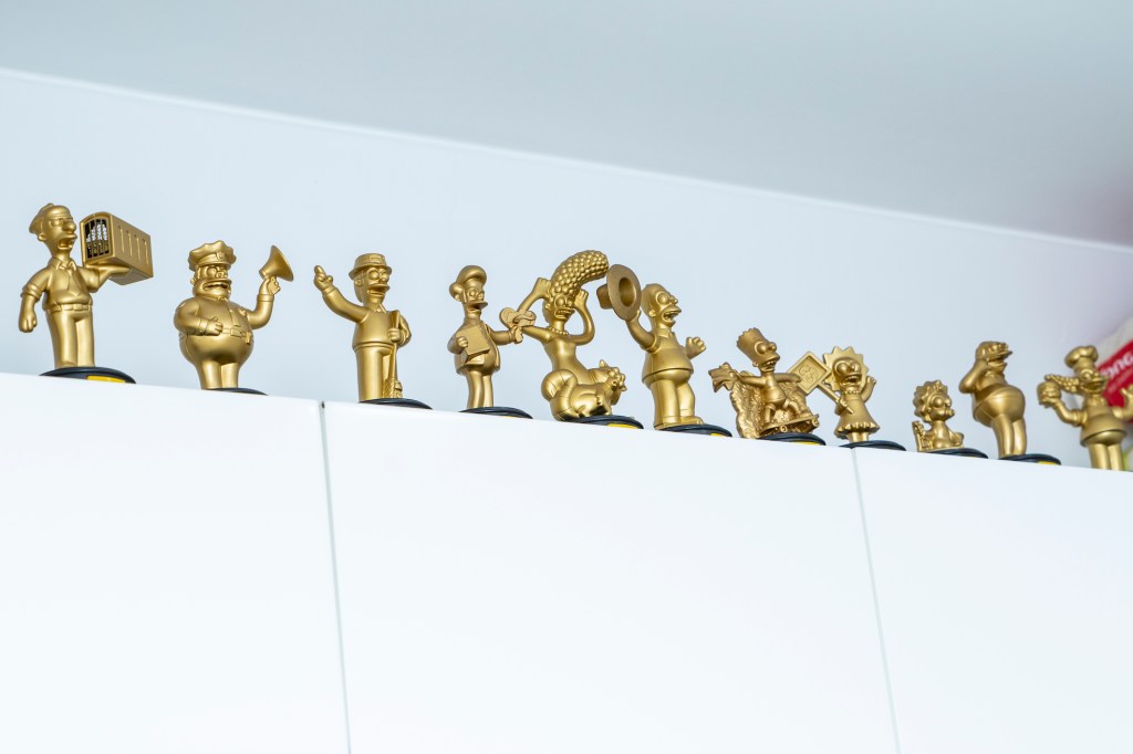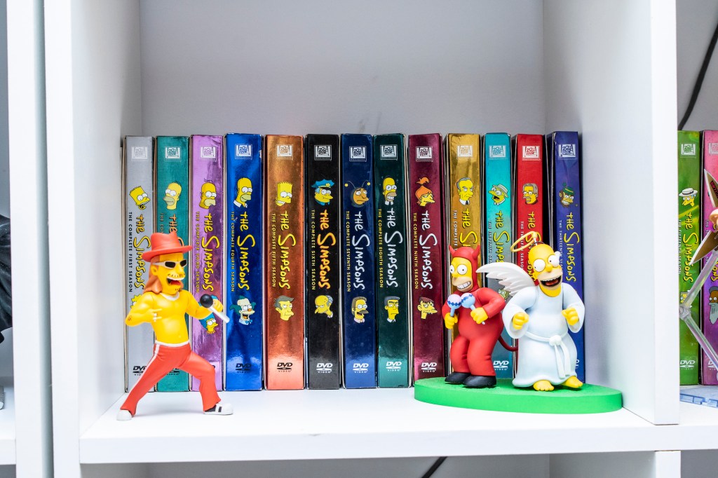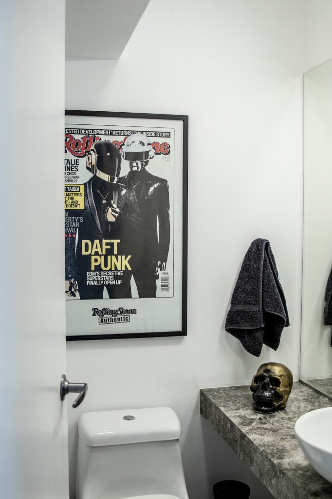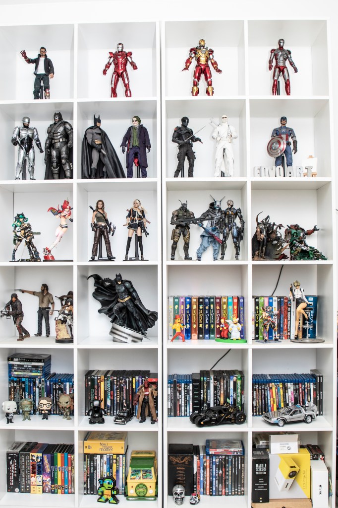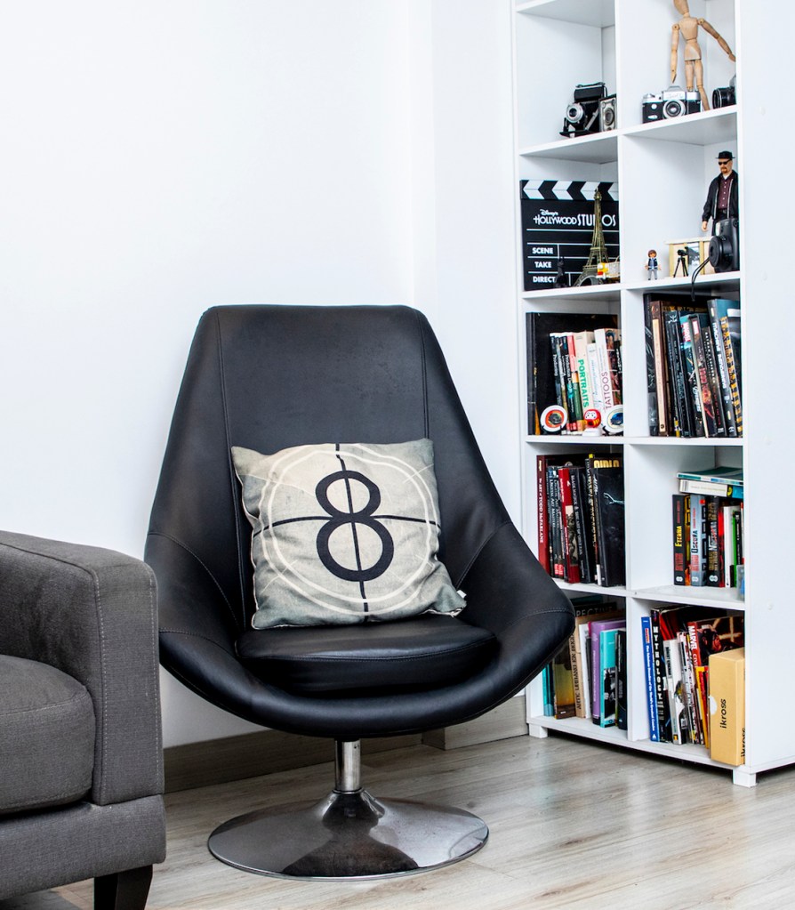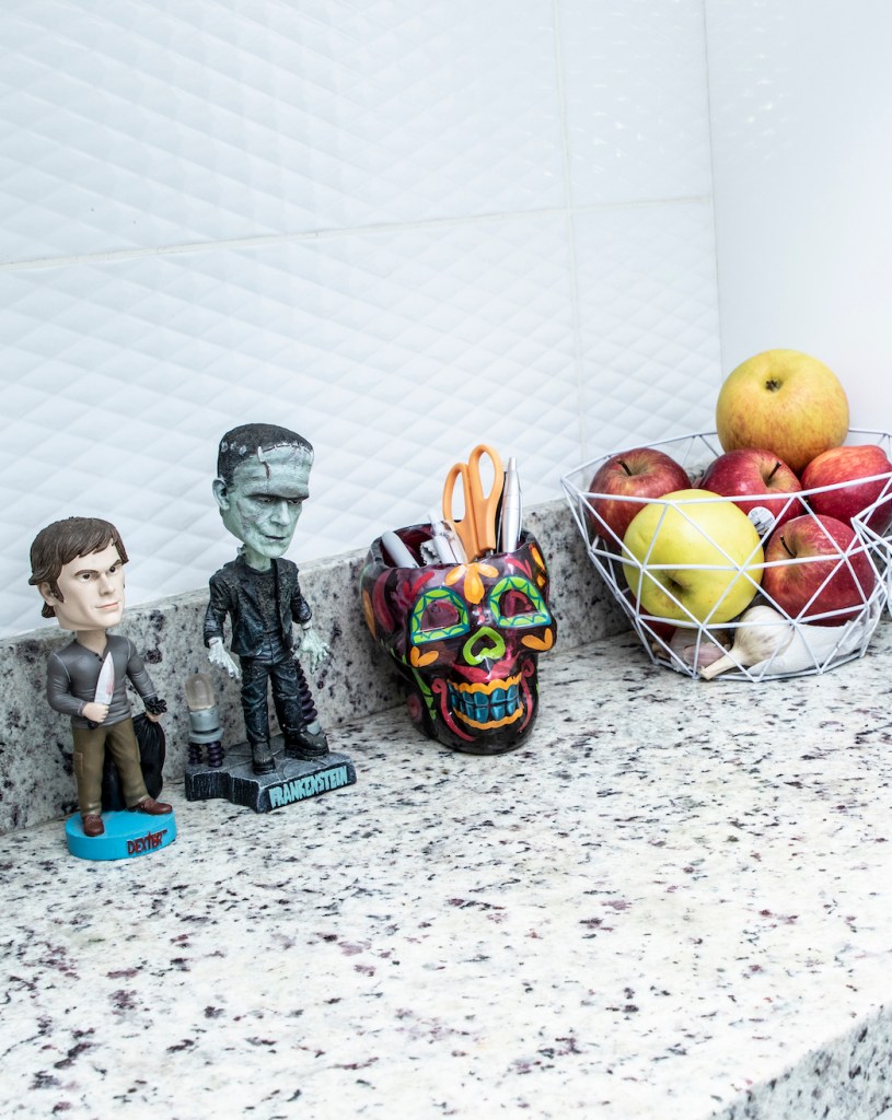 “Ha sido todo un reto ubicar mis objetos. Todas estas colecciones que ves se han hecho a lo largo de muchos años… Tengo juguetes, discos, películas, cámaras… Me gusta coleccionarlos, pero también me gusta poder verlos y tocarlos. Armar mi departamento tenía una motivación práctica, pero también he querido crear un lugar que me motive y que me recuerde cosas. Siempre he visto mucha televisión, dibujos animados, películas… La calavera como elemento tiene que ver con el rock. Y las películas de terror, que me encantan. Por más que pinte tan colorido…”.