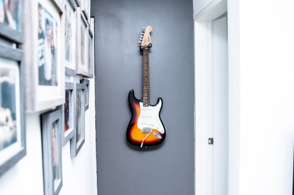 Cuando entró a enseñar en un instituto superior, ahorró sus primeros sueldos para comprarse una Fender y aprender a tocar guitarra… Descubrió que le va mejor pintando, recuerda con una risa. Sin embargo, nunca quiso deshacerse de ella porque fue “fruto de su trabajo” y le recuerda a la experiencia de enseñar. Además, la música es una de sus grandes fuentes de inspiración. Su guitarra fue una de las primeras cosas que encontró lugar en su depa.