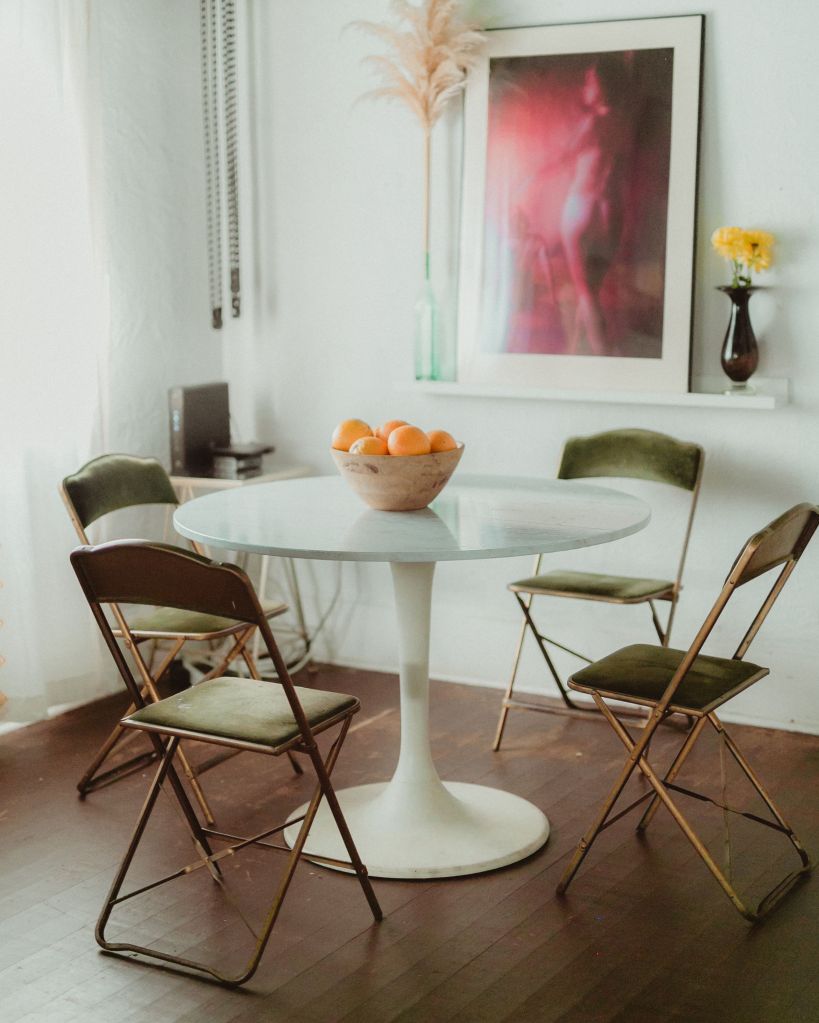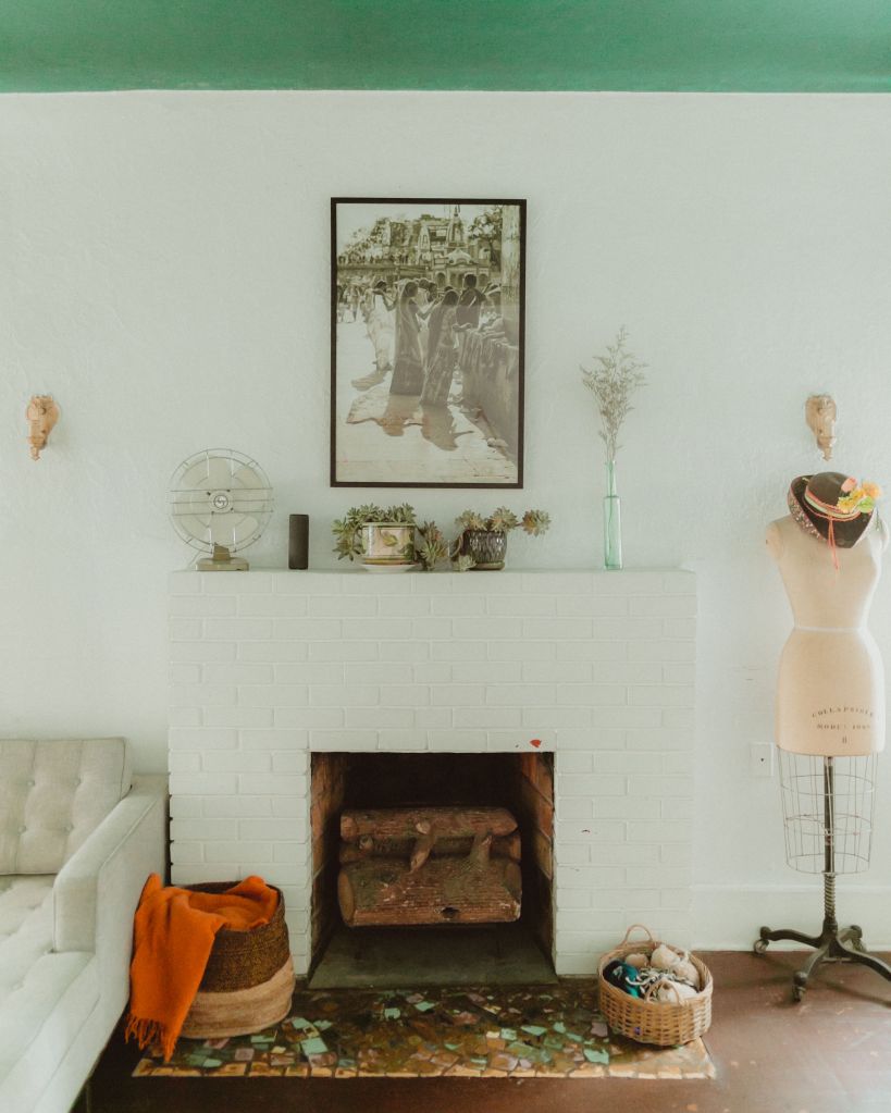 El comedor, que es minimal y sencillo, tiene unas sillas de líneas sutiles que son plegables y por eso muy prácticas, ya que Celia desarma el comedor y baja los rollos de backings que tiene montados, cuando necesita un estudio en casa. Las cortinas hacen una luz muy bonita, que refleja a través de los bordados de la tela. Le encanta los detalles: aprendió a notarlos gracias a los viajes que hacía con su madre, en los que conoció a muchos artesanos y al valor de su trabajo a mano. No sabe quién hizo la foto que corona el comedor, pero le gustó la suavidad de la imagen. Sobre la chimenea, en cambio, tiene una pieza cuya autoría es muy especial: es una foto de unas mujeres en la India, y se la regaló la fotógrafa y maestra de yoga y meditación Noelia Madiedo, espontáneamente, apenas Celia le dijo que le encantaba. Es un símbolo de generosidad.