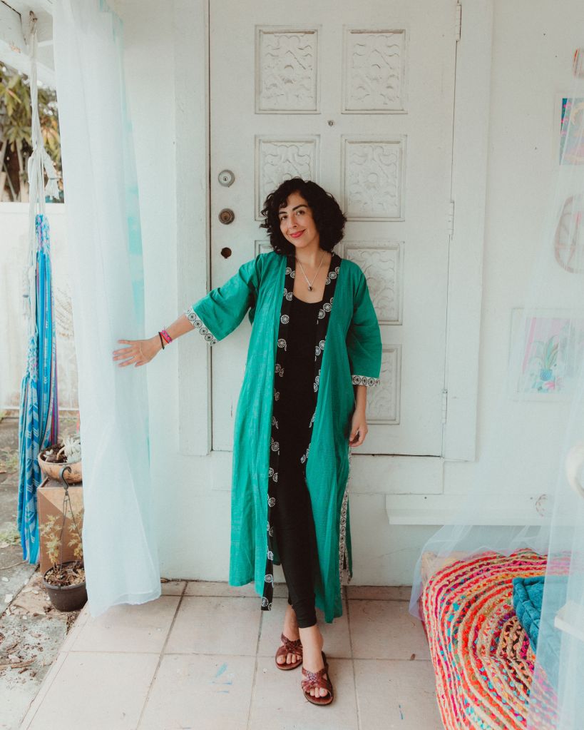 Su espacio de meditación ha sido su último proyecto en casa. Lo ha armado en el patio, sobre el pequeño porche. Esta lleno de flores y tiene un tul que la protege de los mosquitos mientras cierra los ojos y se concentra. Hace unos años no hubiera considerado necesario tener este espacio; para ella, significa una evolución.