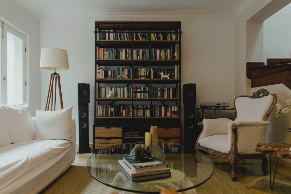 El espacio en sí no es tan grande, pero tiene tres plantas, y buena altura de piso a techo. En la sala, Valeria ha puesto un par de butacas que fueron de su abuela (afuera, en el patio, están las sillas de estilo colonial que también heredó de ella y que tienen más de cien años). Consiguieron un aparador para la sala que al final se ha convertido en el librero de Joshua, que es muy aficionado a la lectura. Valeria también aprecia los libros como objetos decorativos, porque hacen más cálido cualquier ambiente.