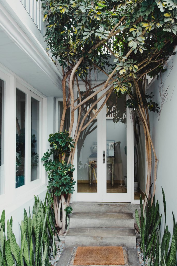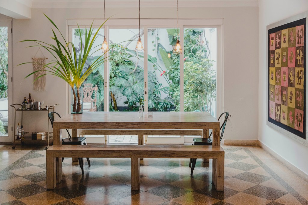 Llegaron con sus muebles, pero de la casa antigua pidieron quedarse con el comedor –un robusto tablero con bancas como las de parque, en madera wash–, que es hoy el punto de encuentro y el corazón de la vida cotidiana. Otra herencia muy importante es la frondosa vegetación que recibieron. Ellos agregaron algunas macetas para el interior, pero se han ocupado con el mismo esmero de los árboles y plantas de hojas grandes que ya habitaban las terrazas y los distintos ambientes. Valeria siente que, al hacerlo, al tomar con agradecimiento la posta, se han hecho parte de la historia de la casa. La vida sigue a través de ellos.