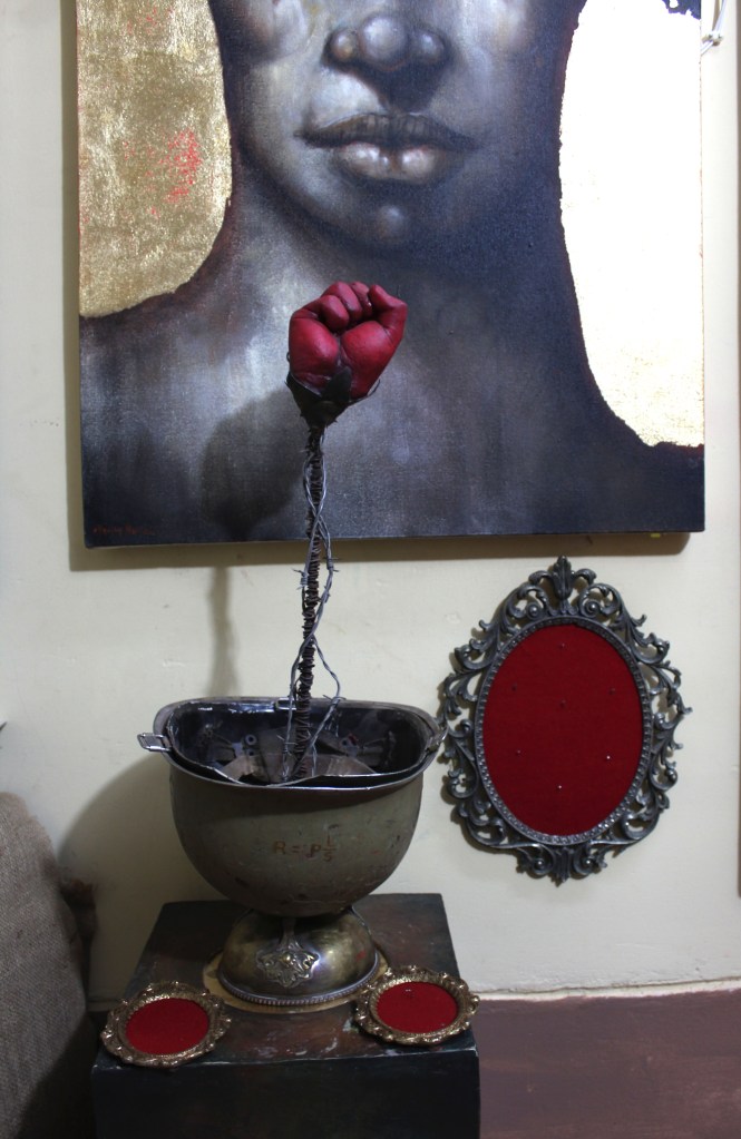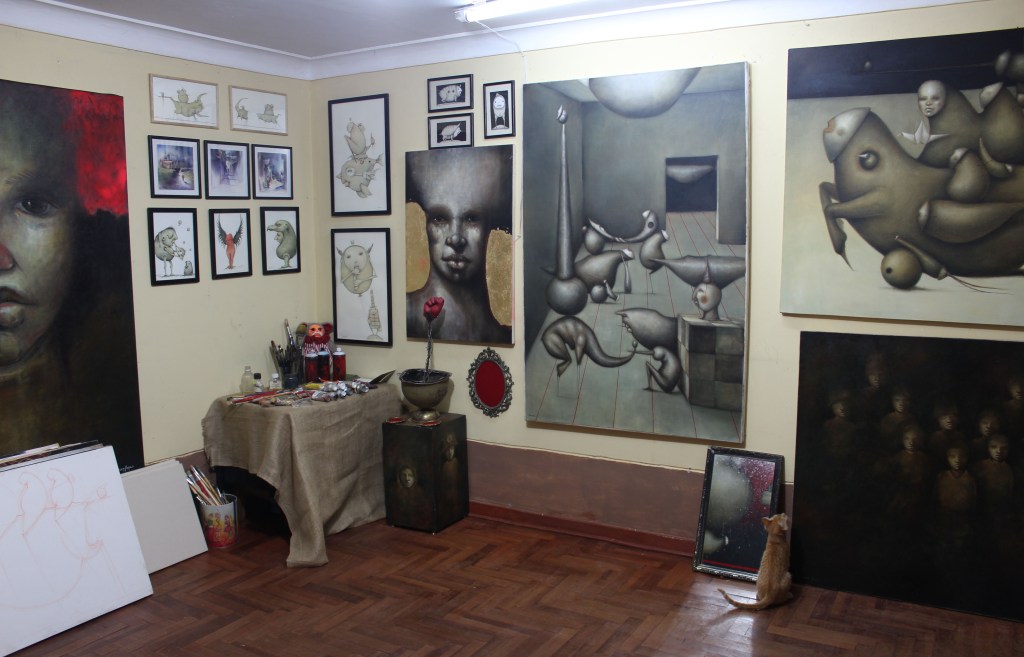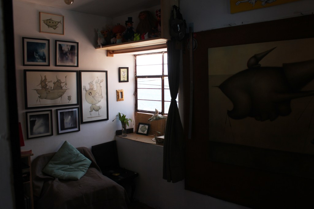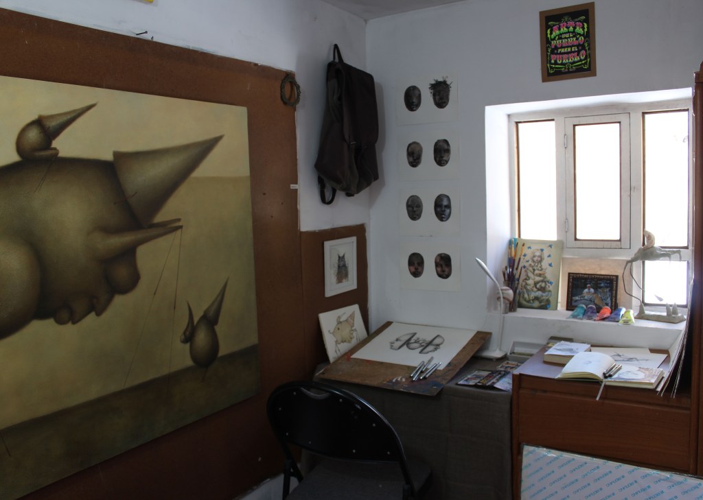 En la primera planta de la casa tenían una gran habitación que usaban como depósito: Edson limpió el lugar; sus padres aprovecharon para deshacerse de lo que ya no les servía, y el artista incluso se quedó con algunos objetos para intervenirlos. En este ambiente ha montado su taller de pintura, aquí es donde hace sus óleos en mediano y gran formato. Para pintar, Edson necesita alejarse mentalmente de su entorno: prende la música, se pone audífonos, y se pierde en esos escenarios surrealistas, oníricos, que tanto persigue con su pincel.
