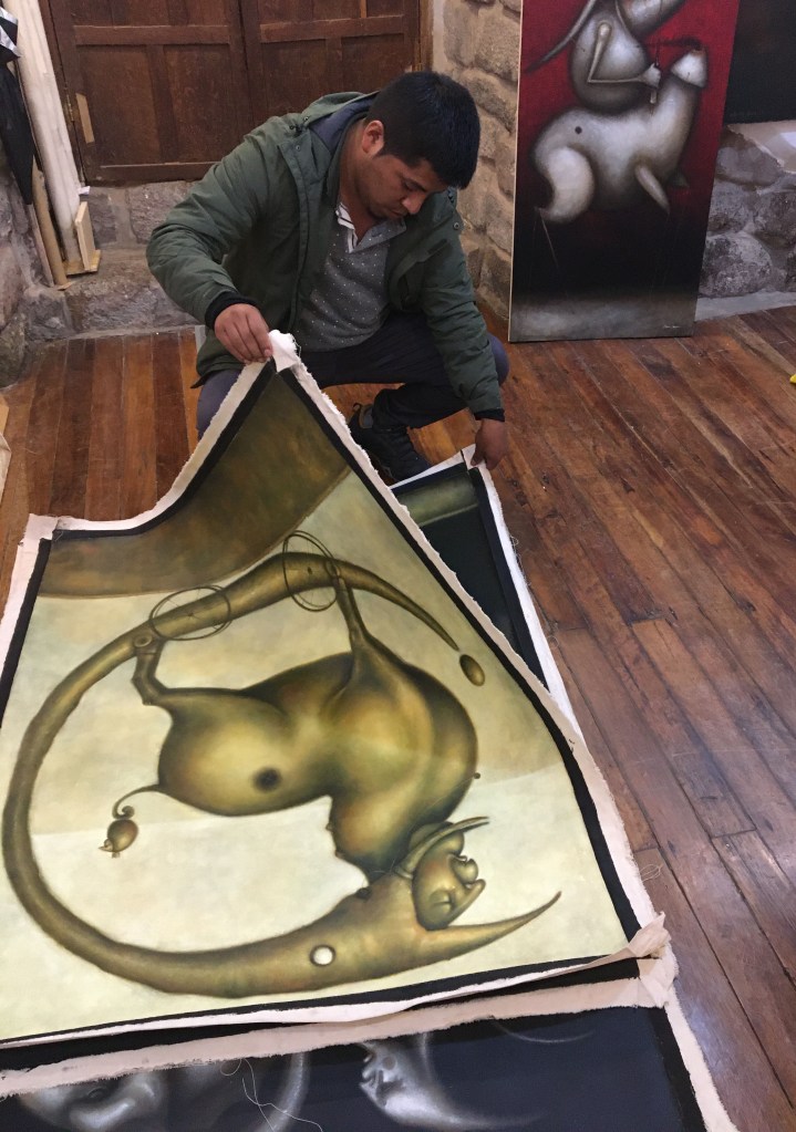 Edson también mantiene un espacio fuera de casa, una especie de pequeña galería de arte que está a cuadra y media de la Plaza de Armas. Quiso que sea un lugar distinto, y funciona como un workshop en el que él va trabajando y la gente puede verlo pintar, y acercarse a otra obra expuesta. También recibe la obra de otros artistas emergentes cusqueños. Entiende la riqueza de compartir los espacios.