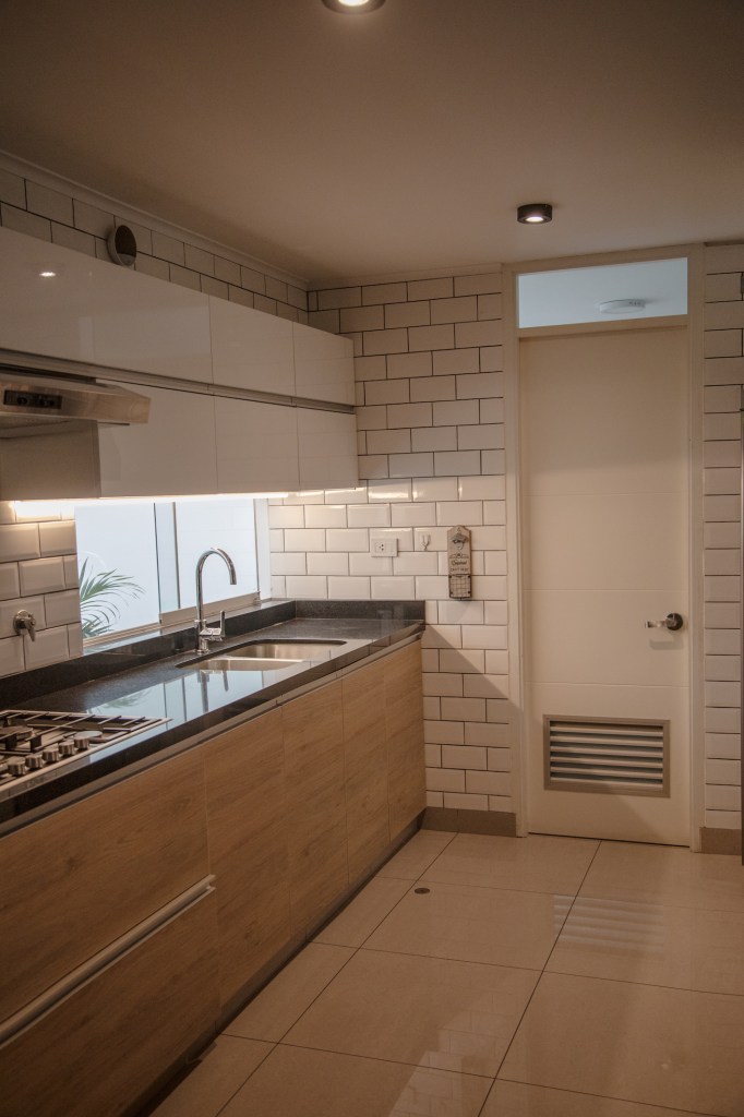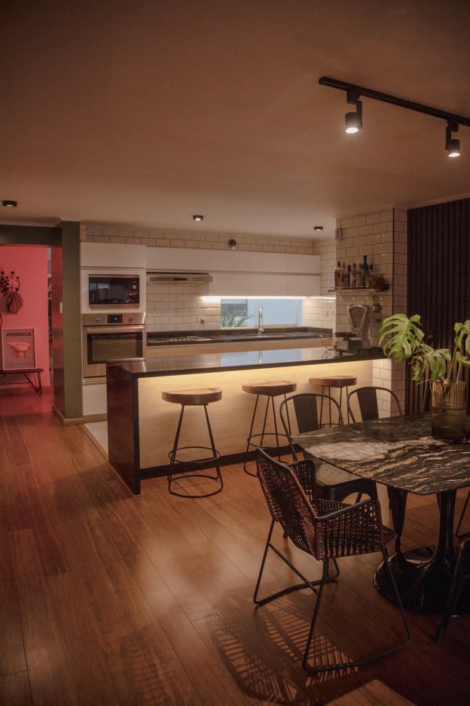 Tuvo que sentarse a pensar qué quería de su espacio personal, algo que en casi un año no había tenido tiempo de hacer. Las superficies cambiaron. El área social se hizo con contrastes y carácter. La cocina abierta tiene mayólica blanca y una barra enchapada en piedra negra. La pared principal de la sala está recubierta por madera oscura con ranuras, que da una textura muy especial. Al otro lado de la habitación, la pared verde es el fondo perfecto para los muebles oscuros que César prefiere.