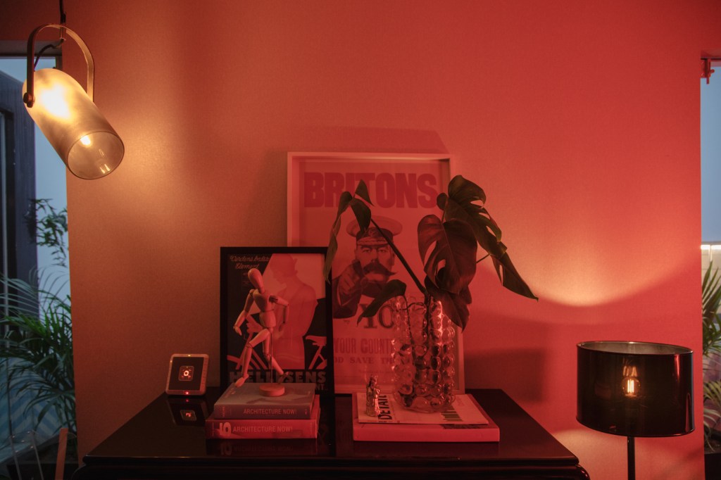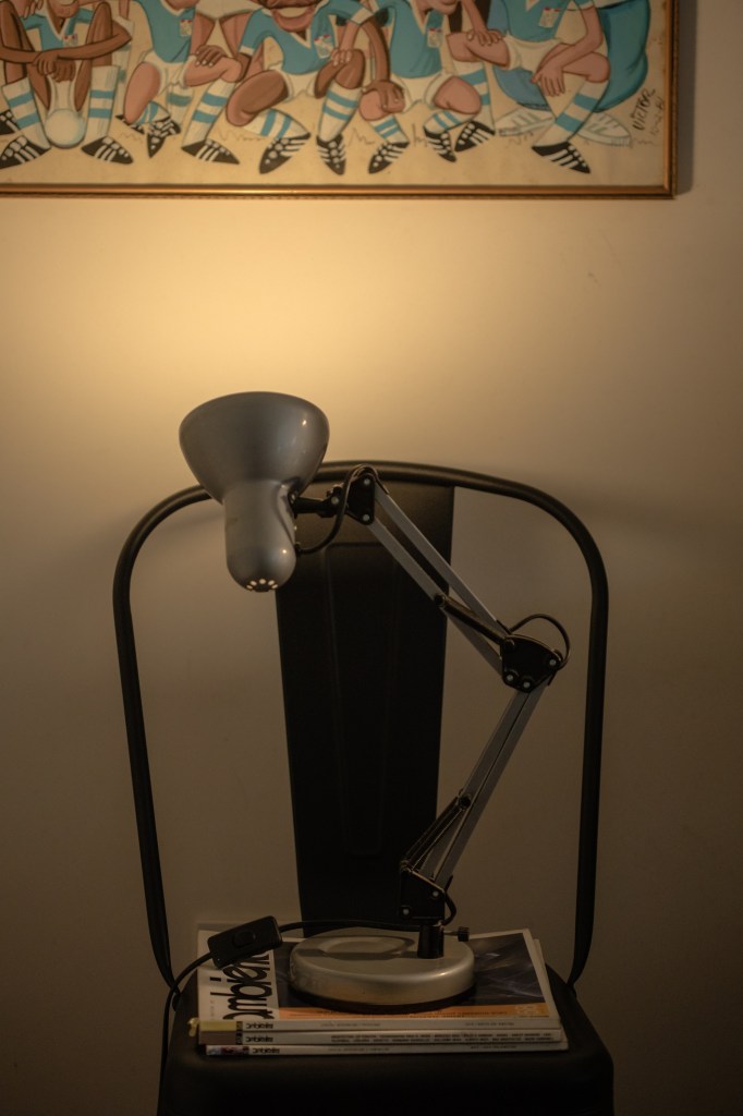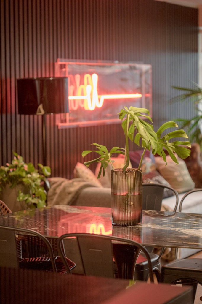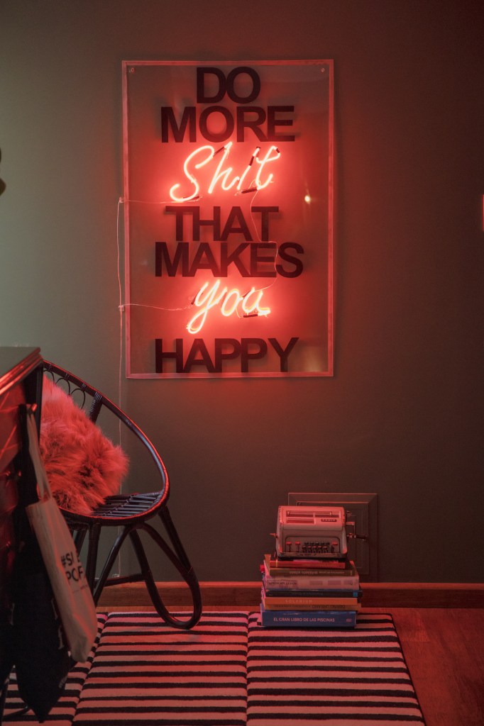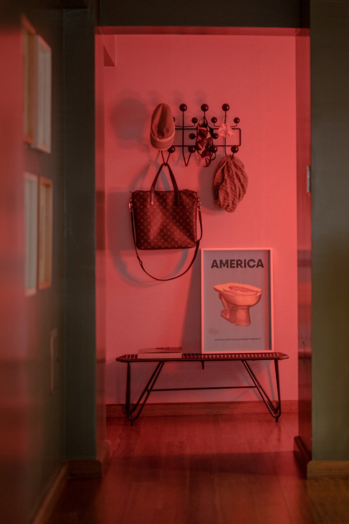 La luz lo es todo aquí. Oscurece pronto, y César lo resuelve con luz indirecta y cálida (siempre). Le encantan los neones, en la mayoría de sus proyectos los incorpora. Obviamente, es un elemento decorativo que tenía que estar presente en su depa, y es lo que genera la atmósfera del lugar. El neón naranja, al mezclarse con la luz amarilla de las lámparas, adquiere distintas tonalidades a medida que van pasando las horas: rojo, naranja, rosa… El arquitecto juega así con intensidades y colores, y los ambientes dinámicos se van transformando del día a la noche. El neón más importante corona la sala: es la línea de la vida. ¿Qué significa para él? “Pueden pasarte mil cosas. Puede pasarte un divorcio, una enfermedad, hasta una pandemia. Pero también puede nacer una hija… Pueden pasarte un millón de cosas buenas y malas y así es la vida. Así que este es un símbolo que significa mucho”.