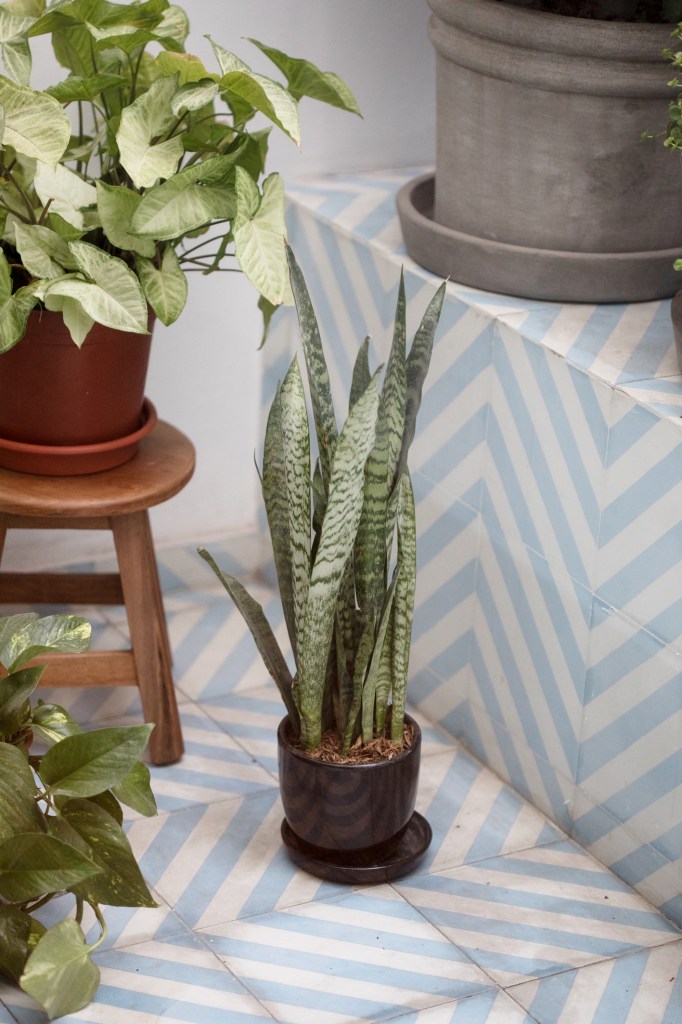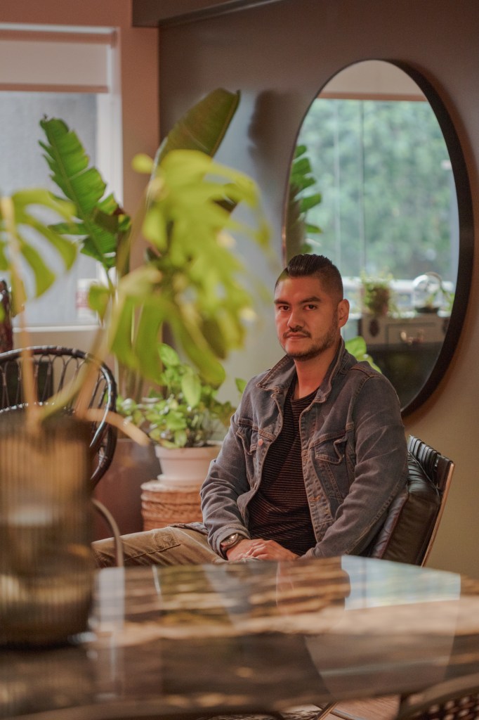 Mandó a hacer la mesa de comedor en un mármol negro, pero con mucha veta. Ya tenía las sillas Tolix; las sillas Acapulco y las butacas de ratán las había mandado a hacer mucho antes de la pandemia, pero no había tenido tiempo de ir a recogerlas al taller. Las bancas de la barra las rescató de un proyecto, así como el sofá que inicialmente era en ele y solo tuvo que modificar. Aunque hay una atmósfera ciertamente masculina, los cojines, los motivos florales, los colores, las plantas: todo contradice el típico cliché de depa de soltero. Por eso, ese cojín que dice “macho” con letras bordadas en perlas, es una provocación divertida y una ironía.