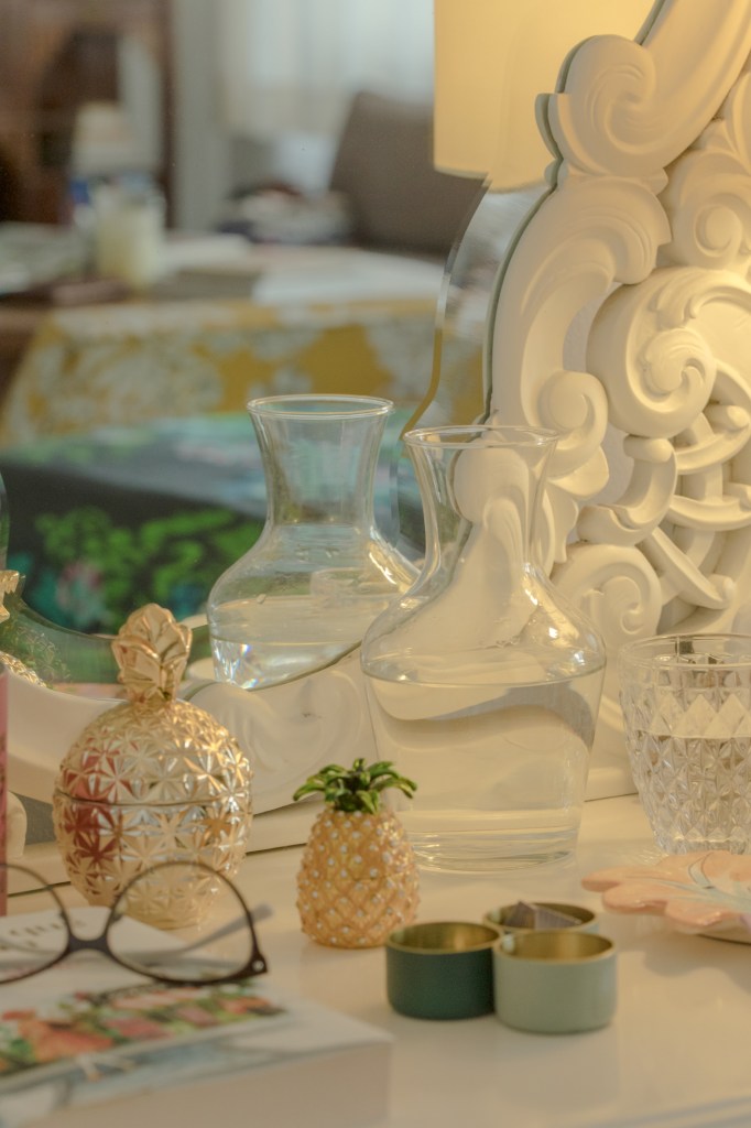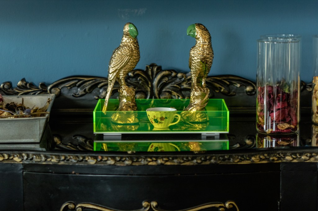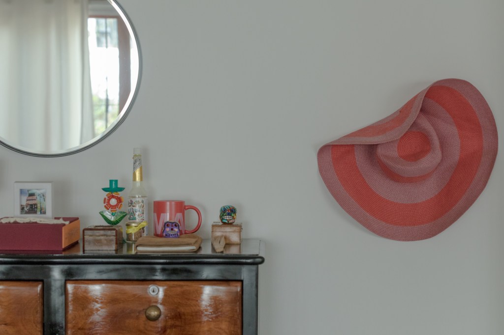 Su esencia está entre lo moderno, lo clásico y lo vintage. Le gusta rescatar y transformar muebles. Por ejemplo, tomó el aparador que había sido de la casa de su abuela, le quitó las puertas, le puso columnas y espejos, y lo convirtió en la chimenea decorativa que sirve como remate de su sala. Pero también le gusta divertirse con los ambientes. Mandó a hacer grandes letras en espejo que formen la palabra “yes” y colgó la frase en esa misma pared, como diciendo “sí al vestido; sí acepto; sí, vamos con tu idea Betania”. Combina su decoración con las piezas que usa en sus eventos. Tiene demasiadas como para almacenarlas todas en cuartos cerrados. Integrándolas en sus ambientes las cuida mejor, y le sirve que estén a la vista. Le gusta la idea de que todo sea colorido, y que todo se encuentre y se mezcle.