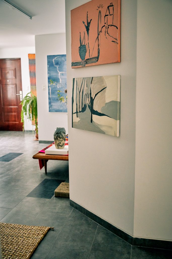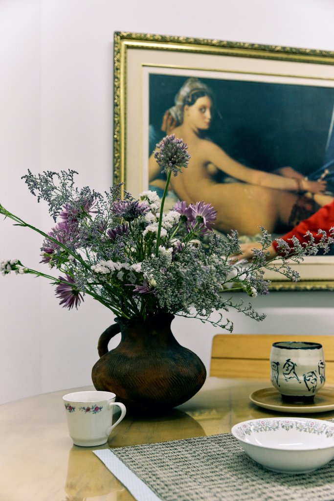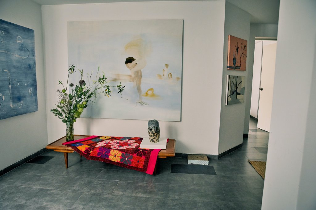 Confiesa que tenía cierta reticencia a la decoración porque sentía que muchas compras de arte se hacen con eso en mente, “y entonces acaba siendo más importante la estética que el discurso”. Sin embargo, su experiencia de construir estos ambientes le ha hecho ver con ojos más amables las distintas formas que existen de consumir arte, de llegar al arte. Ella misma está afanadaza con la belleza (casi escultural) de los arreglos florales, con las formas novedosas que ha encontrado (con ayuda del artista Daniel Tremolada) para ubicar las piezas. Ha sido divertido. “Al decorar este depa he ido conectándome con esa forma de consumo, he ido abriéndome a la posibilidad de introducir el arte en una casa sin comprometer el discurso del artista y buscando armonía, logrando algo estéticamente agradable”, asegura la galerista.