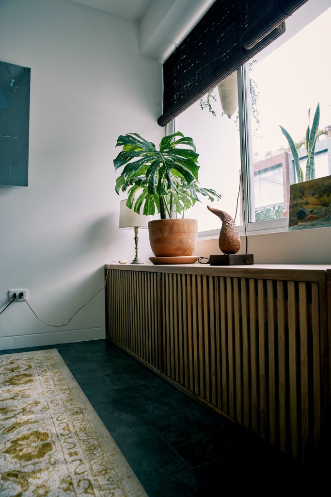 Apenas se dio cuenta de que necesitaba salir del confinamiento de su cuarto, mandó a hacer a Salvador Gonzales del taller Greensalt, una credenza de madera bajo la ventana. Empezó por ahí. Luego, su mamá le trajo casi todos los demás muebles. Algunos son de onda clásica, como la mesa y las sillas de comedor principal, otros más simples y funcionales, como la sala o el comedor de diario. A medida que el lugar se iba a llenando sentía que había muebles con los que no se identificaba, pero a la vez, cree tanto en dejar que las cosas pasen, en no forzar nada, que permitió que todo aquello que le podían dar entrara en su nueva vida.