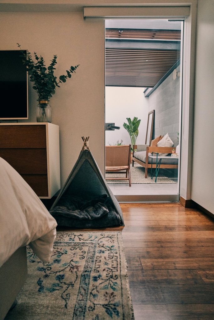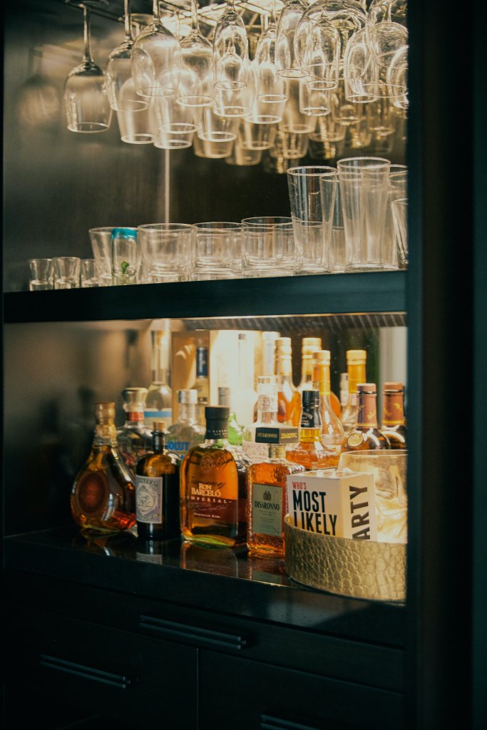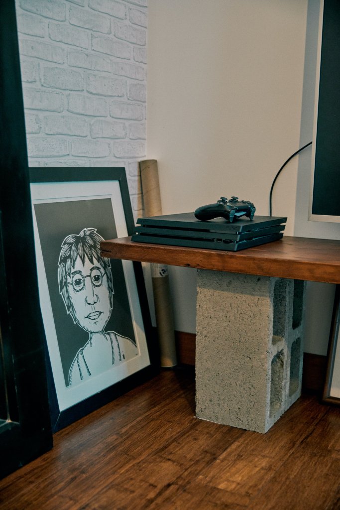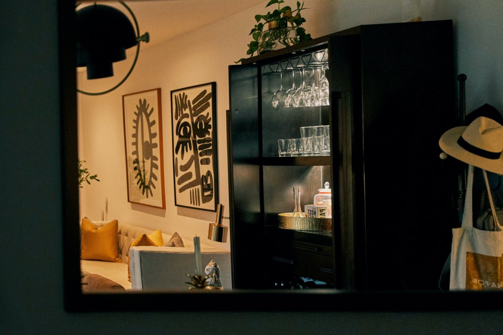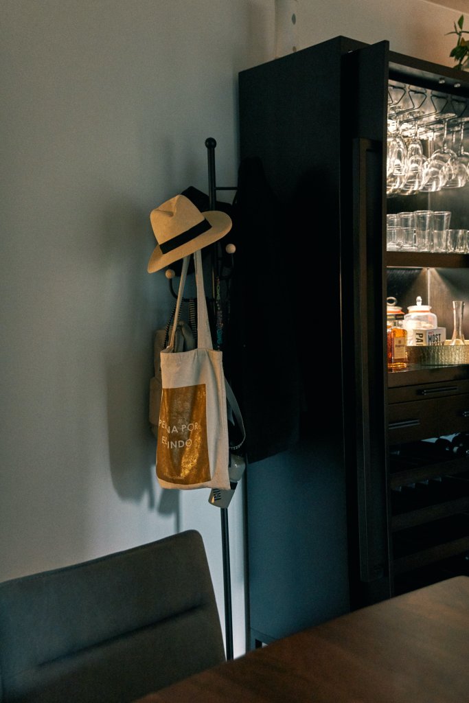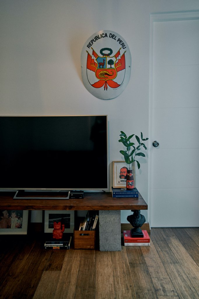 Tiene objetos especiales en casa. El baúl que fue de la abuela de Eduardo, el espejo que era del esposo de su mami, a quien Macarena quiso mucho y que murió recientemente. La mayoría de los muebles son mandados a hacer a medida y algunas cosas, como la alfombra, fueron compradas por internet. En el cuarto de la tele y del playstation gastaron lo menos posible: en lugar de mueble pusieron unos ladrillos de concreto con tablas de madera. Eduardo dejó que Macarena definiera toda la decoración, pero sí pidió diseñar él mismo el bar. Nunca ha sido de recibir a mucha gente en casa, sino más bien de salir. Pero con el bar listo se volvió un anfitrión afanoso, hasta antes que empiece la cuarentena.