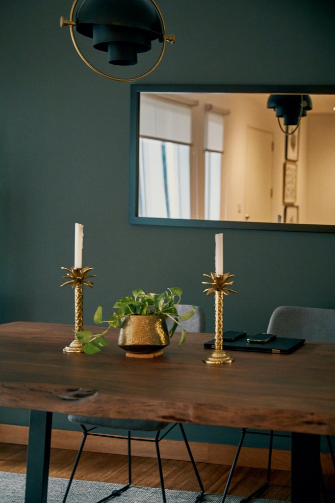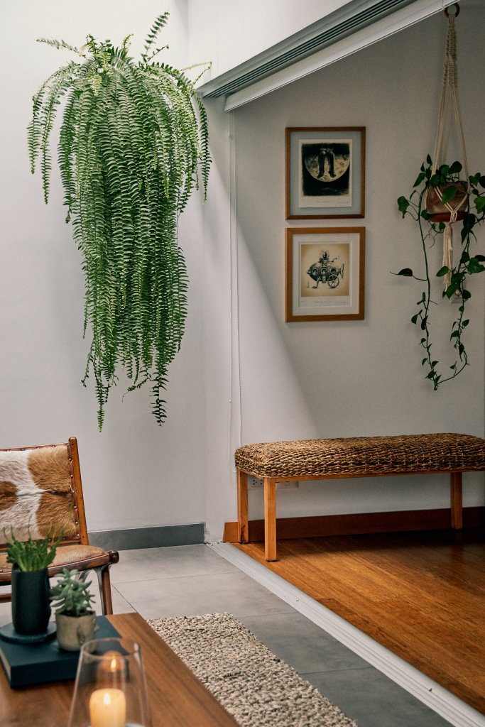Acaban de cumplir un año en el departamento y Macarena sigue cambiando de lugar las cosas todos los días. Confiesa que cuelga un cuadro y al día siguiente se arrepiente de dónde lo colgó, y por eso sus paredes están llenas de huecos macillados y pintados. De alguna manera, aún se siente como jugando a la casita. Le emocionan las cosas cotidianas, como cocinar o comprar un helecho y elegir el mejor lugar para ponerlo. Ella y Eduardo se acaban de comprometer y esta es una de las etapas más lindas juntos.