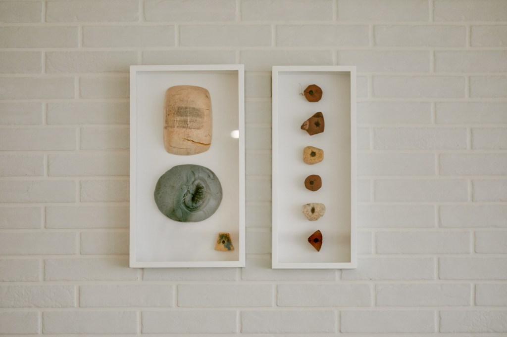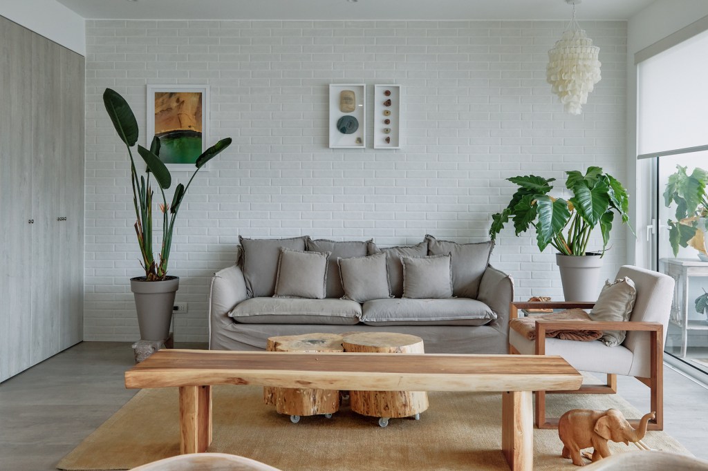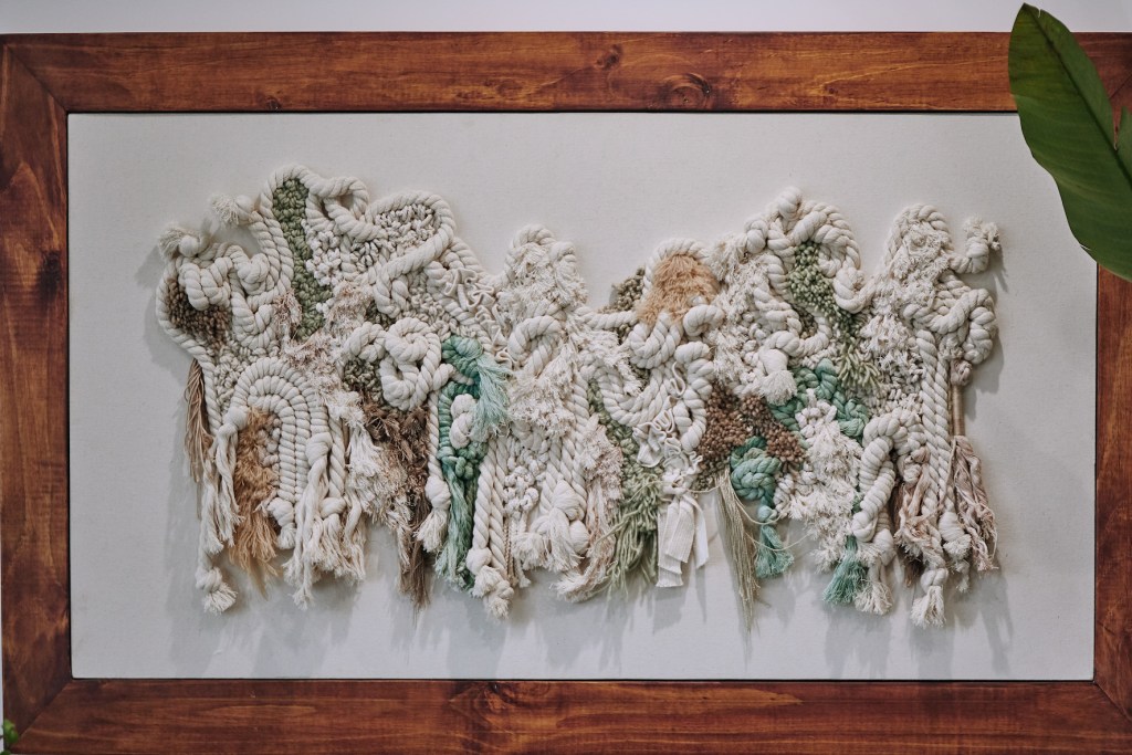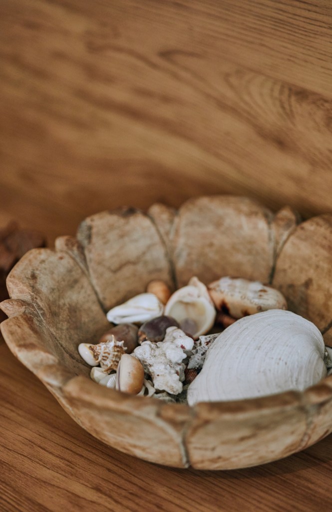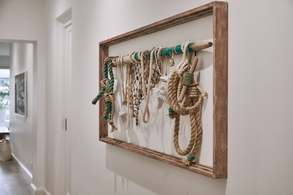 Las sogas de Guille (a quien le gusta bucear y pescar), conchas y elementos de mar que él había recolectado, se han convertido en cuadros y adornos. Unos amigos les regalaron unos troncos cortados: eso sonó increíble, pero de pronto tenían estos pedazotes de árbol, incluso llenos de bichitos. Les recomendaron trabajar con el estudio de diseño Matteria, y convirtieron el regalo en las mesas de centro de la sala y en las bancas del comedor.
