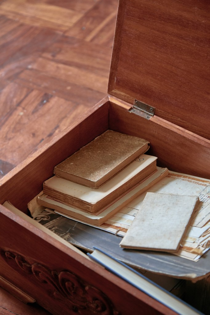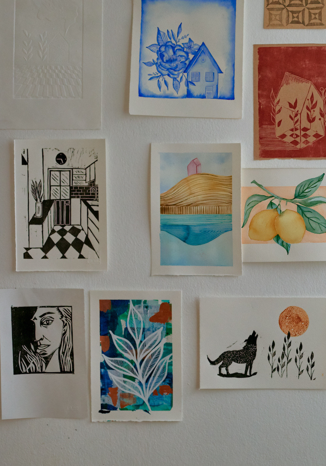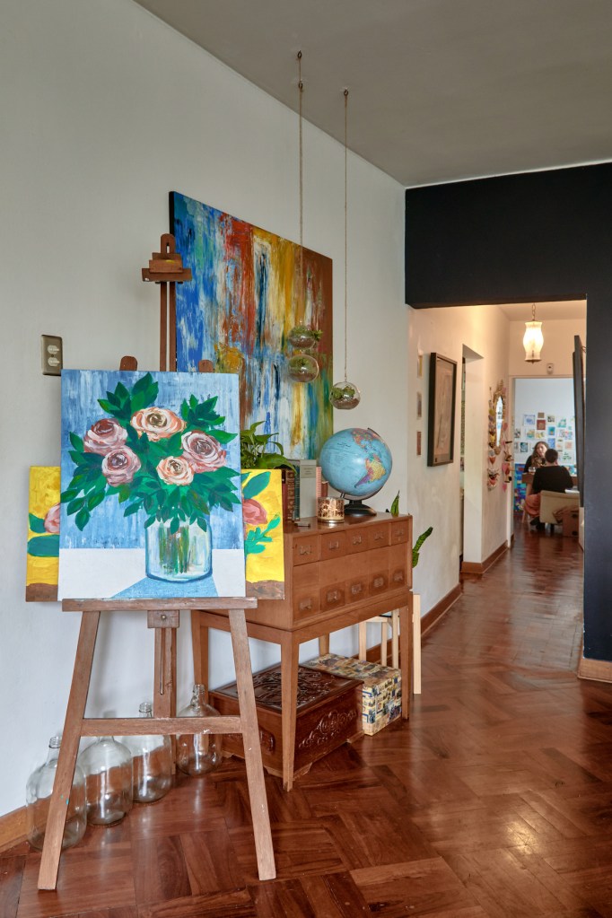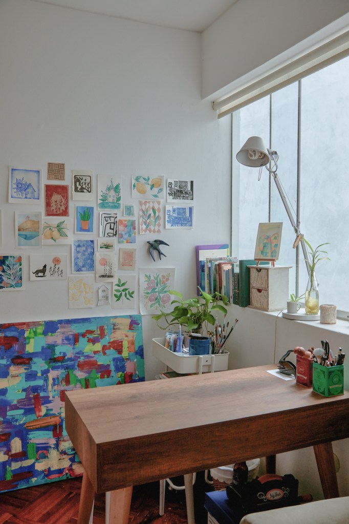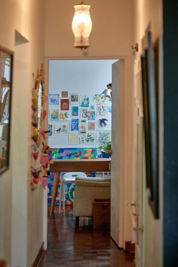 Hay plantas por toda la casa (son un pasatiempo relativamente reciente para ella, pero le fascinan), así como libros, incluso unos muy antiguos, del 1700, relacionados a las raíces de la familia de Rodrigo en Hamburgo. María José ha llenado de dibujos, pinturas y manualidades toda la casa, invitando la creatividad en sus propios hijos. El hogar como motivo artístico en sus obras le atrae muchísimo. Tiene una serie de sillas muy bonita, y suele recolectar imágenes de ambientes hogareños que luego traslada al linóleo y al papel.