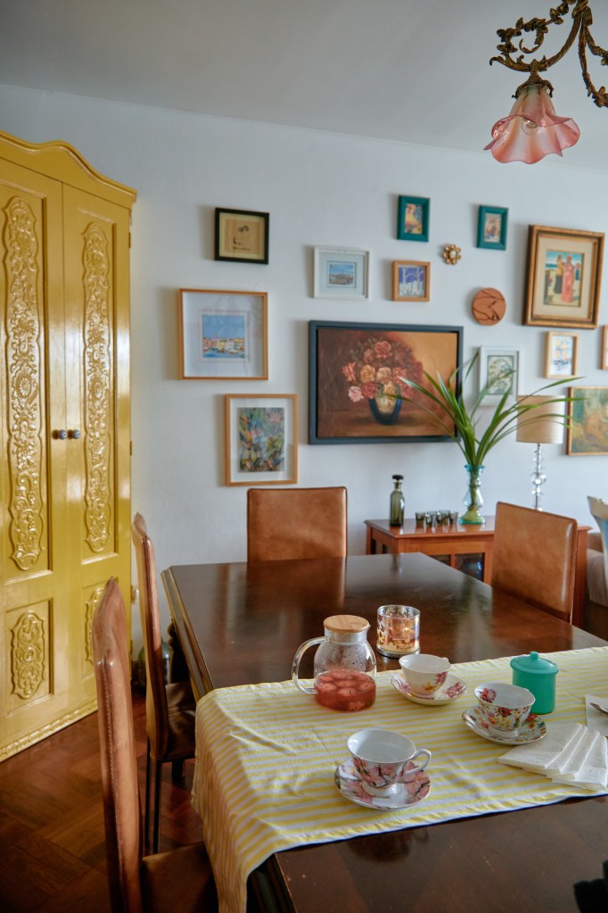 La pared que une la sala y el comedor está llena de cuadros. Algunos los ha encontrado en viajes. Otros son tesoros muy especiales, no tanto por su valor sino por su procedencia, como el bodegón y el paisaje pintados por los abuelos de Rodrigo, ambos artistas aficionados. También tienen un curioso reloj de madera hecho a mano por el padre de Rodrigo. Obviamente, hay pinturas y grabados de la propia María José, que firma como Celi Di Tolla.