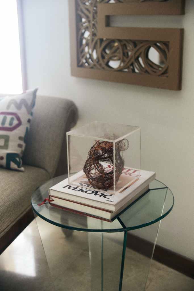 “Generalmente tenemos un montón de cosas que nos gustan y que no queremos botar… y las tenemos guardadas en cajones, en despensas o en alacenas. La vajilla bonita, las cosas que más nos gustan las tenemos guardaditas. Y cuando se te rompe el juego no sabes qué hacer. Yo decidí sacarlo todo: monté unas repisas encima del comedor y he amontonado ahí todas esas piezas lindas, heredadas, incompletas, para poder verlas y disfrutarlas. Hace un tiempo, limpiando, rompí algunas cosas y entonces las empecé a pegar a la lámpara de centro, la convertí en una cosa loca llena de copas rotas. Lo he tenido que desmontar por la remodelación del comedor, pero lo voy a volver a hacer”.