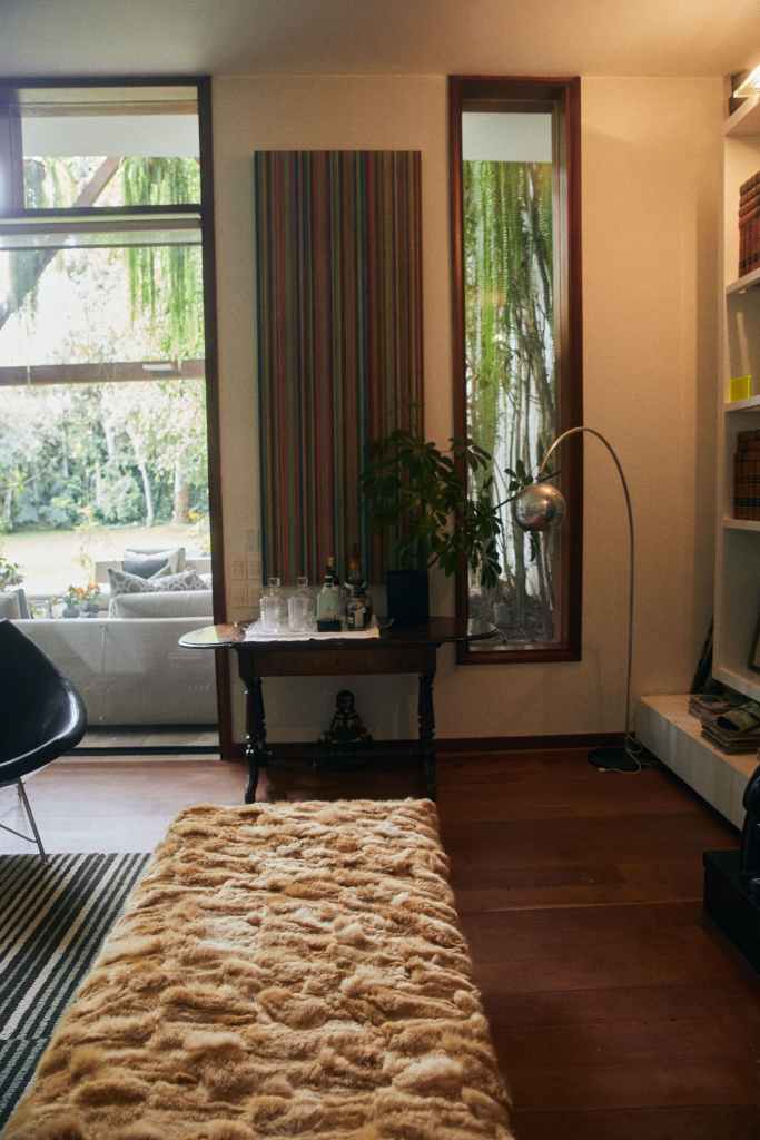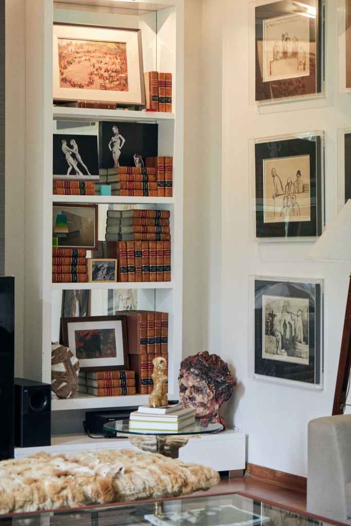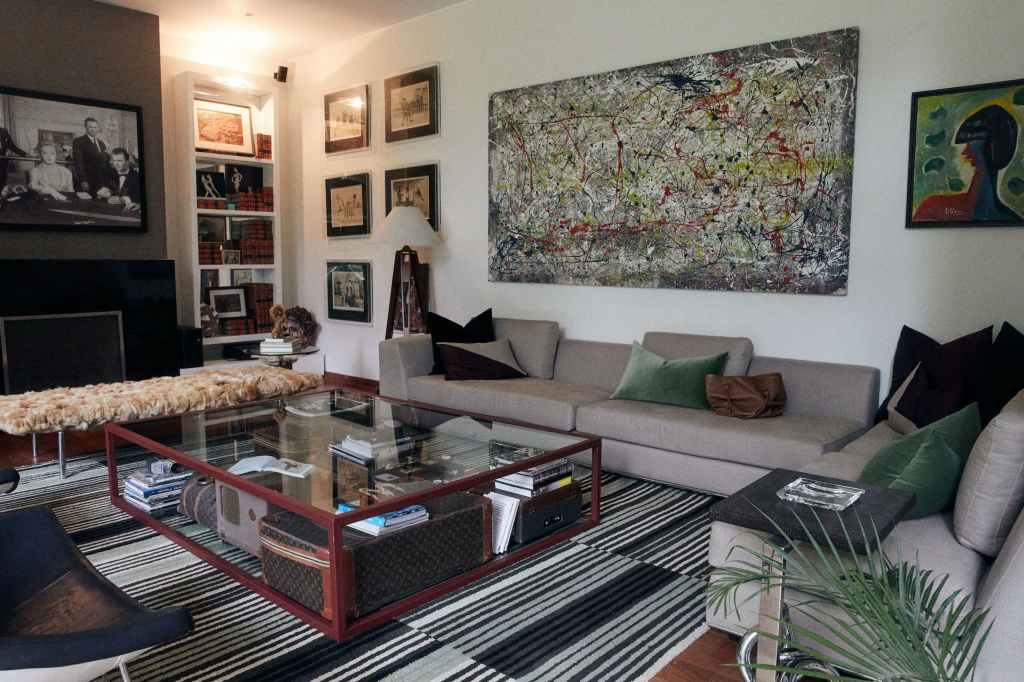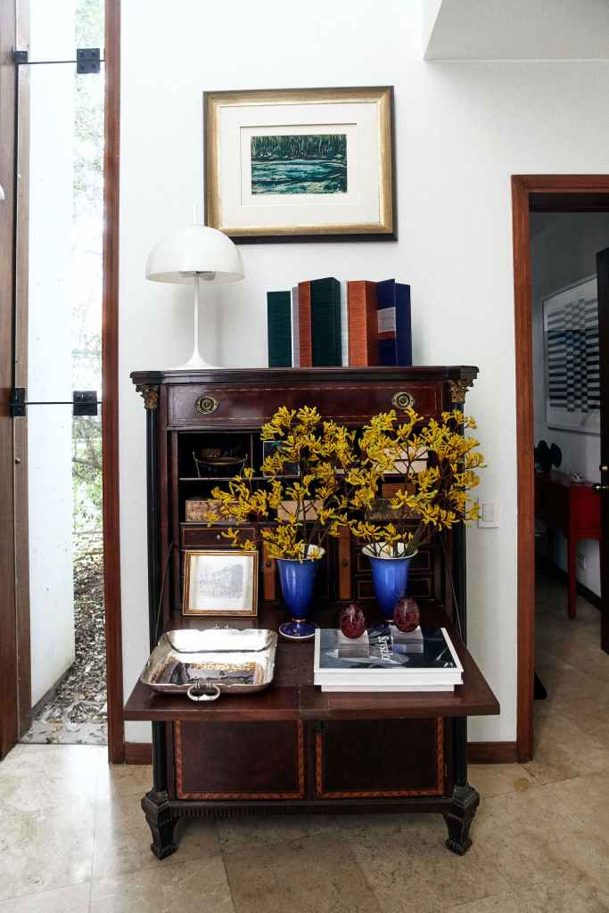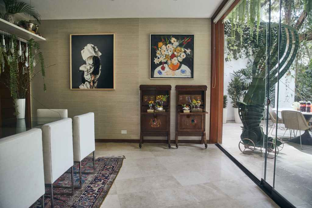 Todas aquellas cosas que guardó durante tantos años fueron encontrando su lugar y su protagonismo en la casa. Amplió una foto que había encontrado de su abuelo cuando fue extra en una película de Marlene Dietrich, y ese es el cuadro que corona su chimenea. Su mamá iba a botar las maletas de Louis Vuitton vintage de su abuela, así que Tania se las quedó. Aún más, mandó a hacer la mesa de centro de la sala de tal manera que pudiera guardar las valijas dentro y que se vean a través del vidrio. Ese mueble es una especie de aparador que contiene muchísimas curiosidades y objetos importantes para Tania: el equipo de grabación de su papá, que era un aficionado al filme, fotos y postales antiguas, adornos como unas sandalias japonesas que encontró en un anticuario. Hace poco, ha forrado los bordes de la mesa en cuero rojo oscuro, para cambiarle el look.