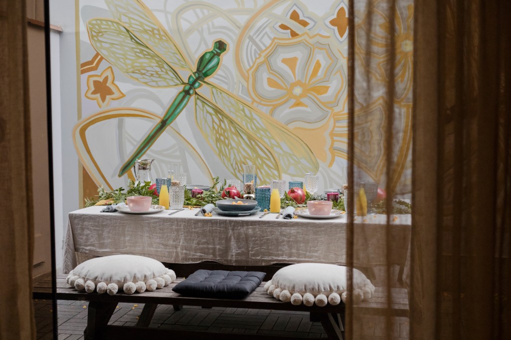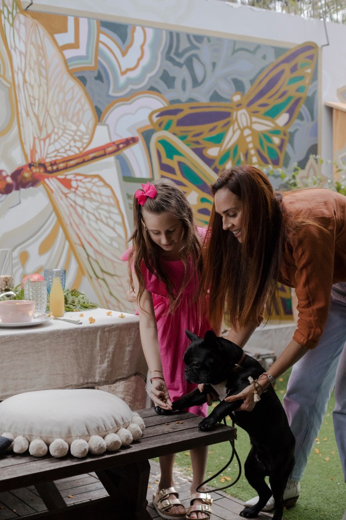Creció en Arequipa y pasó mucho de su infancia en el establo que su papá tenía a quince minutos de la ciudad, con caballos y aires de campo. Quizá por eso sigue obsesionada con los insectos y los ve como buen augurio. Eso explica el tema que eligió para el mural que el pintor Pablo Villegas pintó en su terraza. La obra ocupa la pared que los separa del parque: esa pared les da seguridad, pero quita la conexión directa con el verde, y en unos días de cuarentena particularmente grises, Claudia decidió que necesitaba color, alegría y naturaleza: siguiendo el consejo de su amigo y diseñador de eventos, Carlos Andrés Luna, llamó al artista para pintar mariposas y libélulas en pleno vuelo.