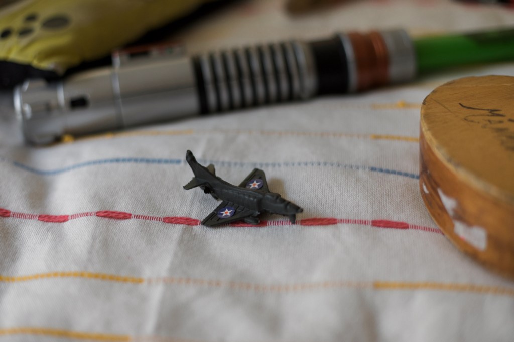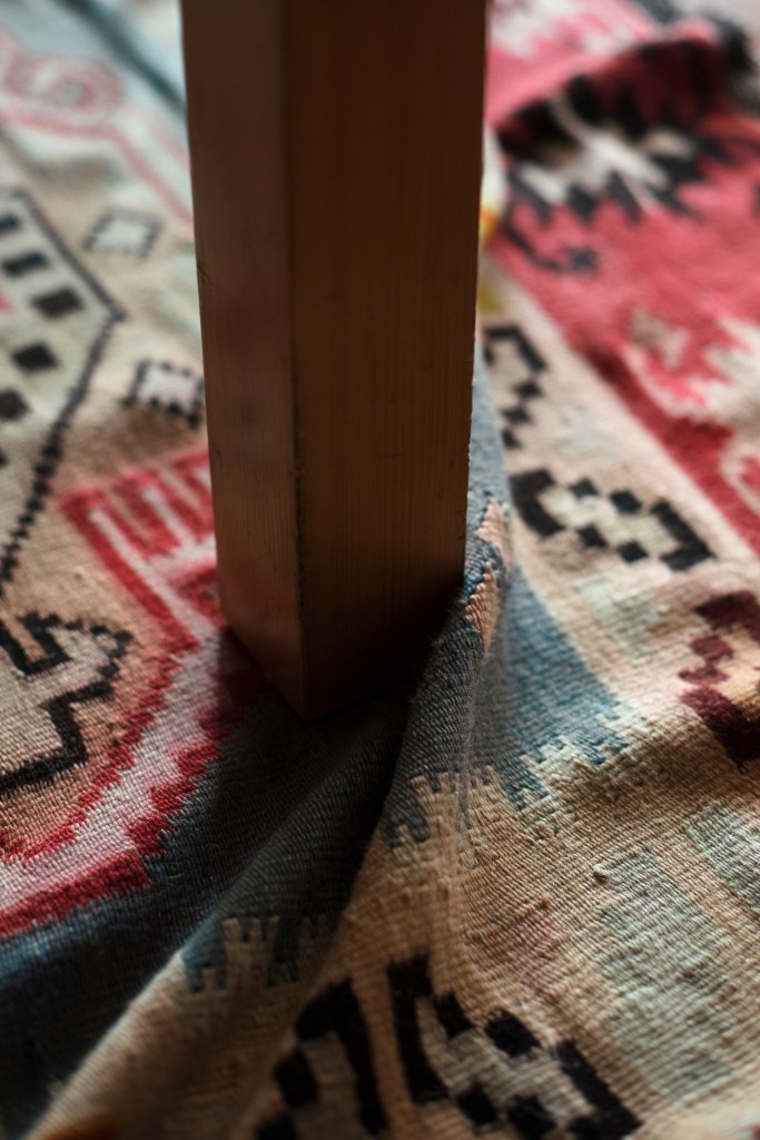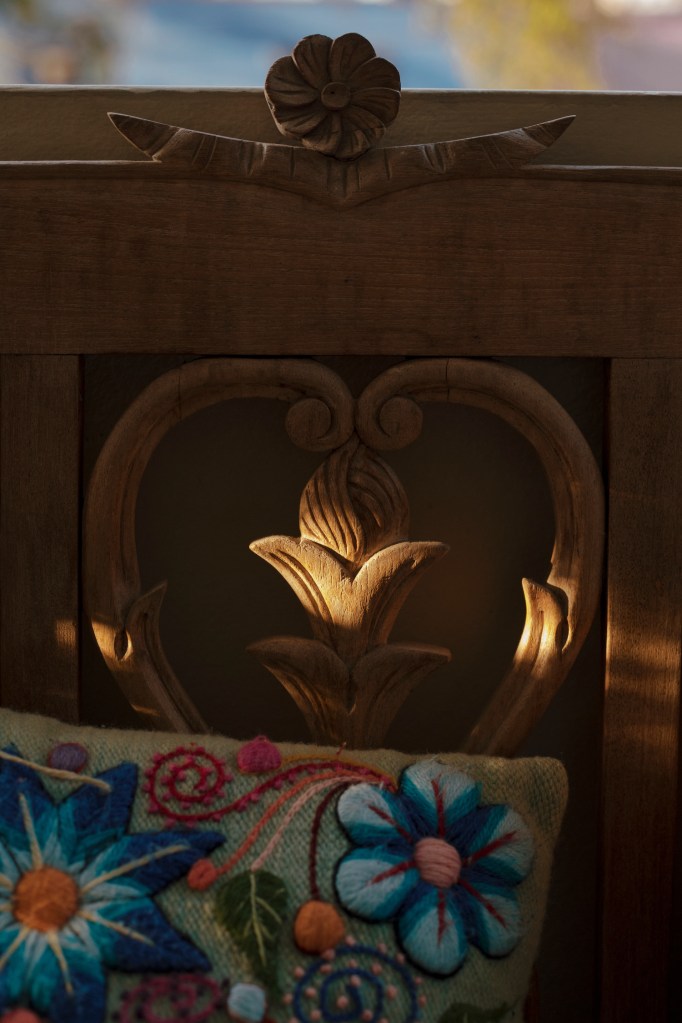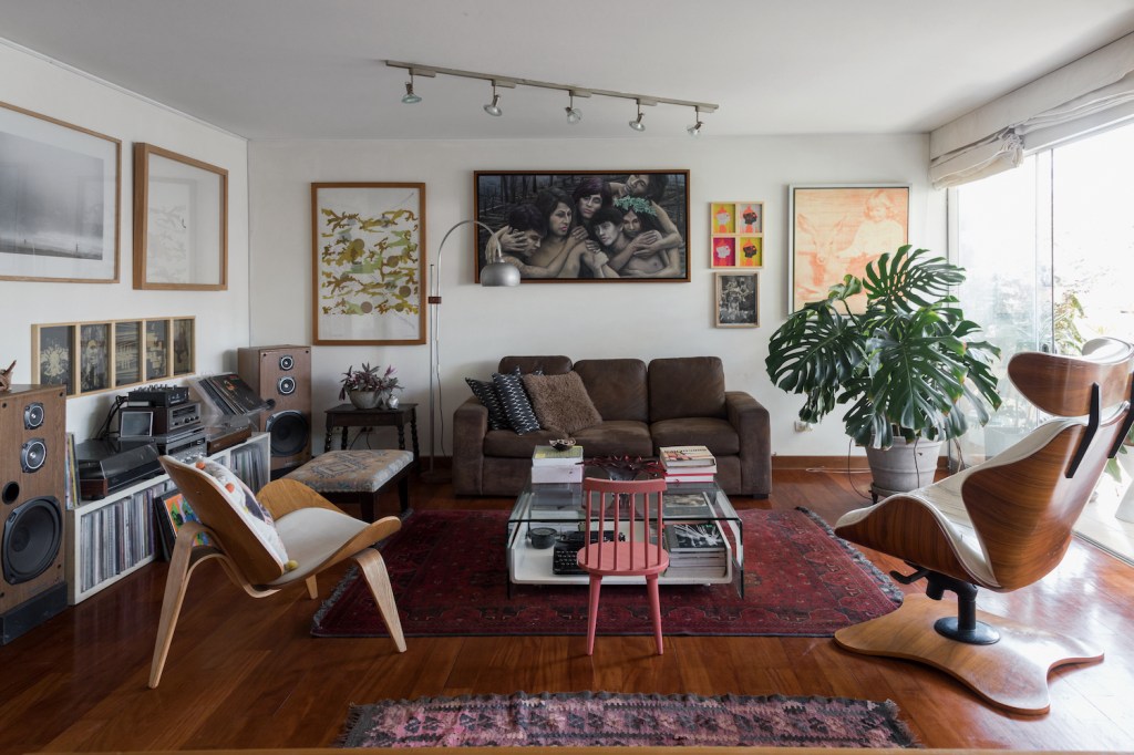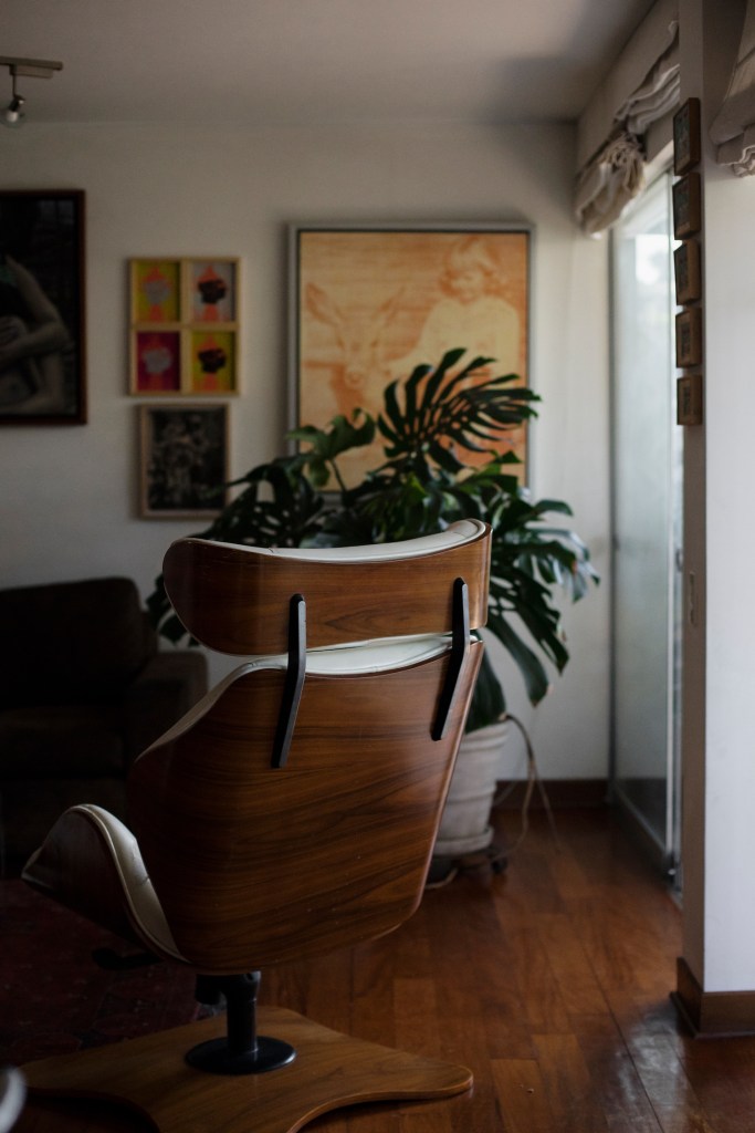 La lámpara del comedor fue un regalo de Ana por su cumpleaños, la encontró en Surquillo. Otros objetos antiguos que encontraron y trajeron son el baúl, la alfombra y la banqueta. También les han regalado piezas. A ambos les interesa ir moviendo el mobiliario, incorporando nuevas cosas, cambiando, añadiendo. Tienen un par de sillas de los años sesenta, y luego el tocadiscos y los vinilos terminan de dar un aire retro al ambiente. Si lo piensa un poco, Goster probablemente prefiere los sesenta como referencia de interiorismo. Dice que, después de todo, fue una época dorada del diseño de mobiliario.