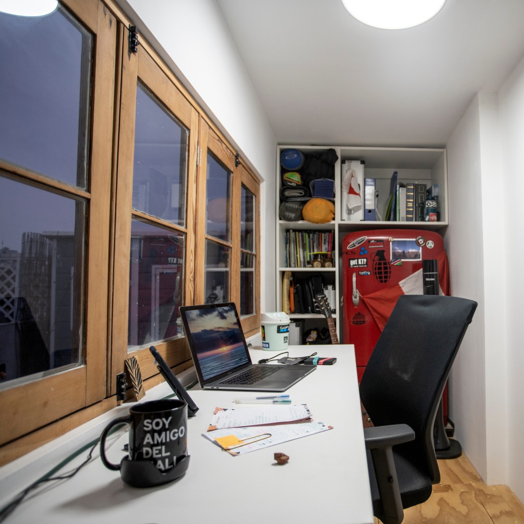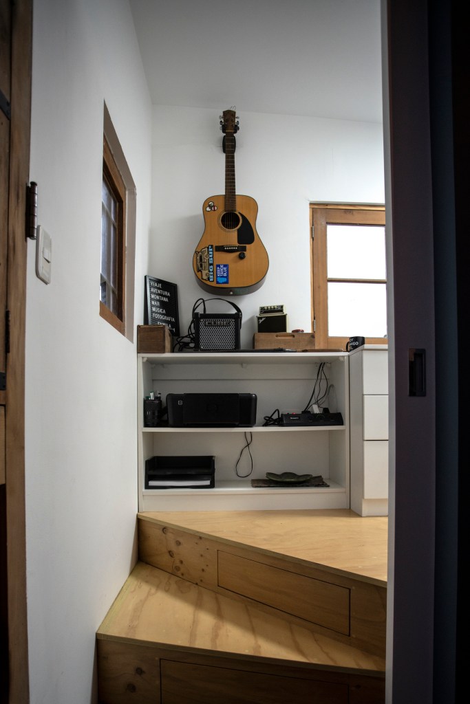 María Luisa armó un escritorio en el dormitorio. Eduardo decidió aprovechar la terraza. Justo subiendo las escaleras e inspirado por las tiny houses (espacios como botes y autos modificados para ser viviendas muy pequeñas), ideó una manera de sacarle provecho a un espacio que no es mayor que 1 x 3 metros. Con ayuda de la arquitecta Mariana Corvacho, elevó un volumen 40 centímetros para generar un falso piso que le sirve como almacenaje y, de paso, una altura que le deja ver un poco el mar. Incluso los peldaños para subir a su mesa tienen cajones ocultos. Encontró un sitio para la refrigeradora antigua de su abuela, solo que no la usa como tal, sino para guardar cosas. En esta oficina pequeña y hecha a medida, Eduardo ha trabajado todos estos meses como director de comunicación y marketing de la agencia de viajes Metropolitan Touring Perú; ahí también ha dibujado los nuevos proyectos para Intu y los suyos propios, sus proyectos personales. Ideando viajes. Tocando la guitarra.