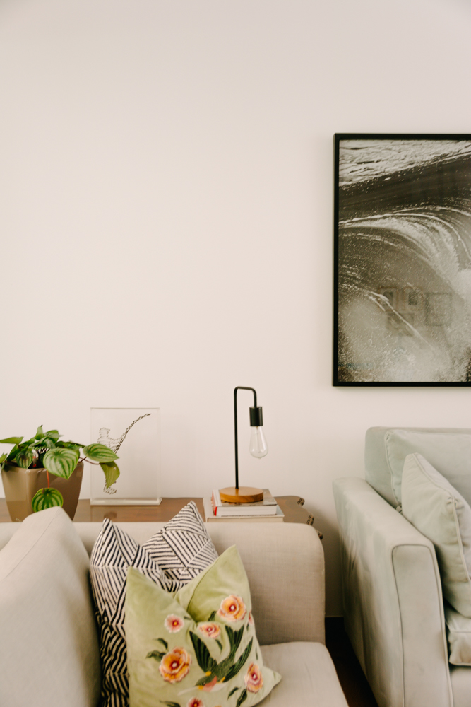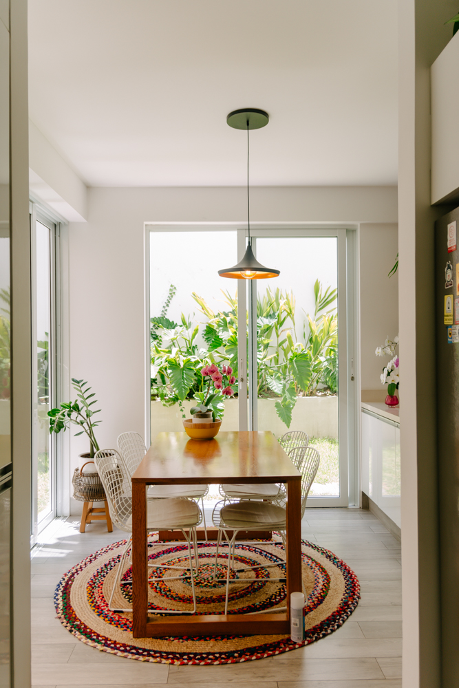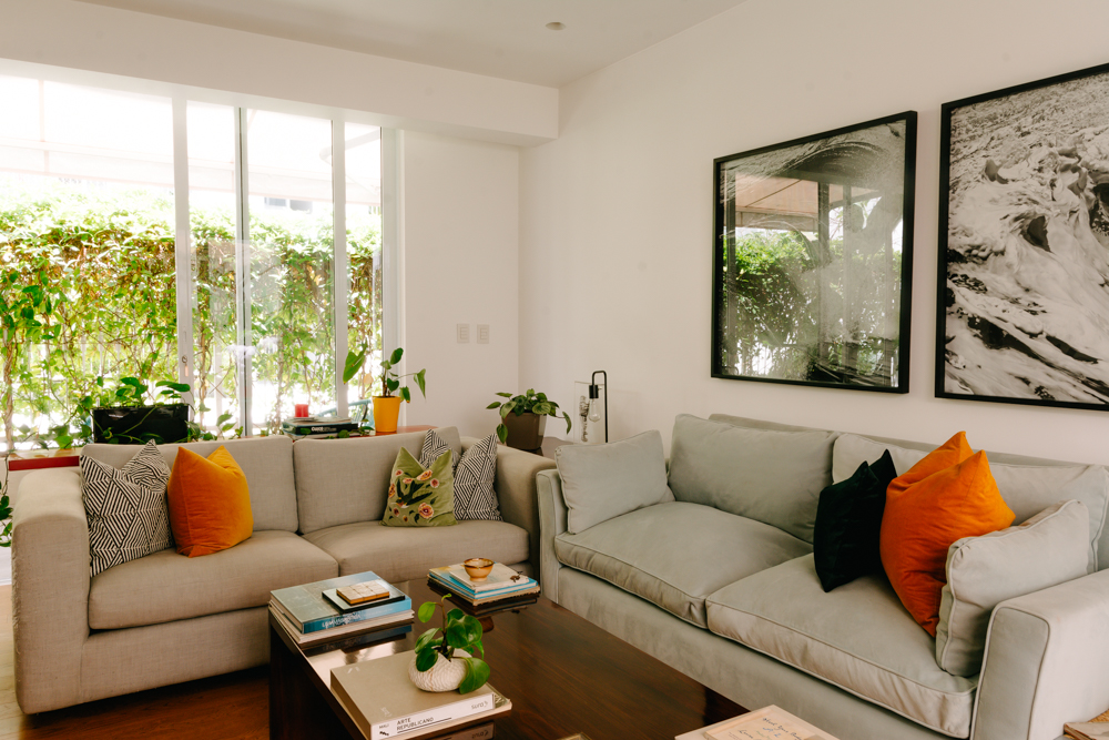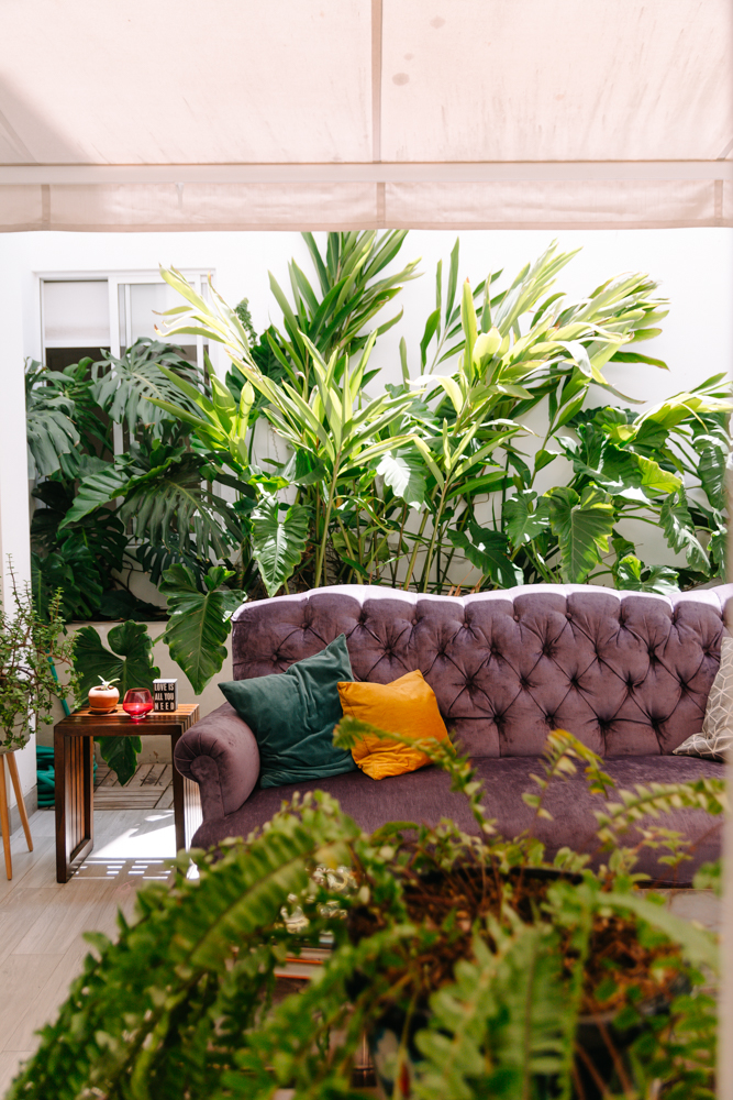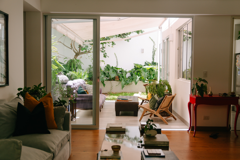 Cada día, se alegra por tener tantas áreas en su depa para compartir el verde, ya sea con palmeras, pequeños árboles, vegetación exótica, y hasta enredaderas en el ducto de ventilación. Agradece porque la distribución en “ele” le permite ganar ventanas en todas las habitaciones, luminosidad y aire por todos lados sin sacrificar privacidad. Sonríe pensando en ese cuarto que en algún momento iba a convertirse en su escritorio, pero hoy ha pasado a ser el estudio donde su esposo hace música, y piensa cómo el hogar mismo va mutando a medida que las necesidades de la familia cambian. En su dormitorio, siente que todavía le falta añadir muchos detalles, sobre todo fotos. Pero para eso hay tiempo. Lo importante es sentirse bien aquí y ahora.