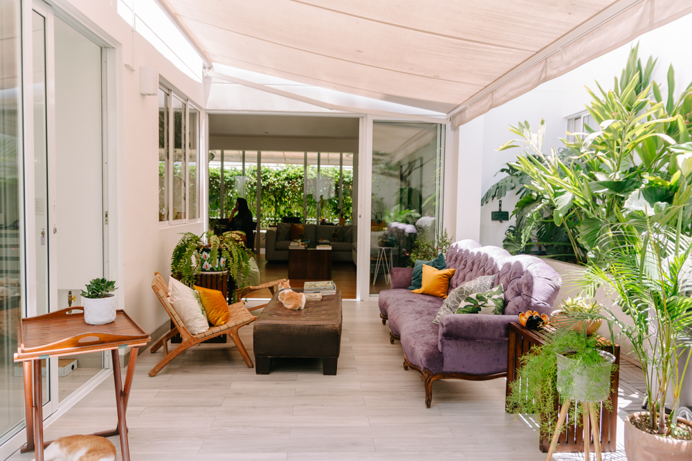 Cuando se mudó al departamento, lo primero que pensó al ver el amplio patio interior fue “quiero jungla”. Así que habló con una amiga que le ayudó a concebir el paisajismo y, juntas, lograron la hazaña de meter un pequeño árbol hasta ahí, pasando por un estrecho pasillo. Ahora toda la jardinera está cubierta de verde, con plantas de hojas inmensas, y el arbolito de la esquina es el rascador perfecto para los gatos, que trepan y corren felices, a sus anchas.