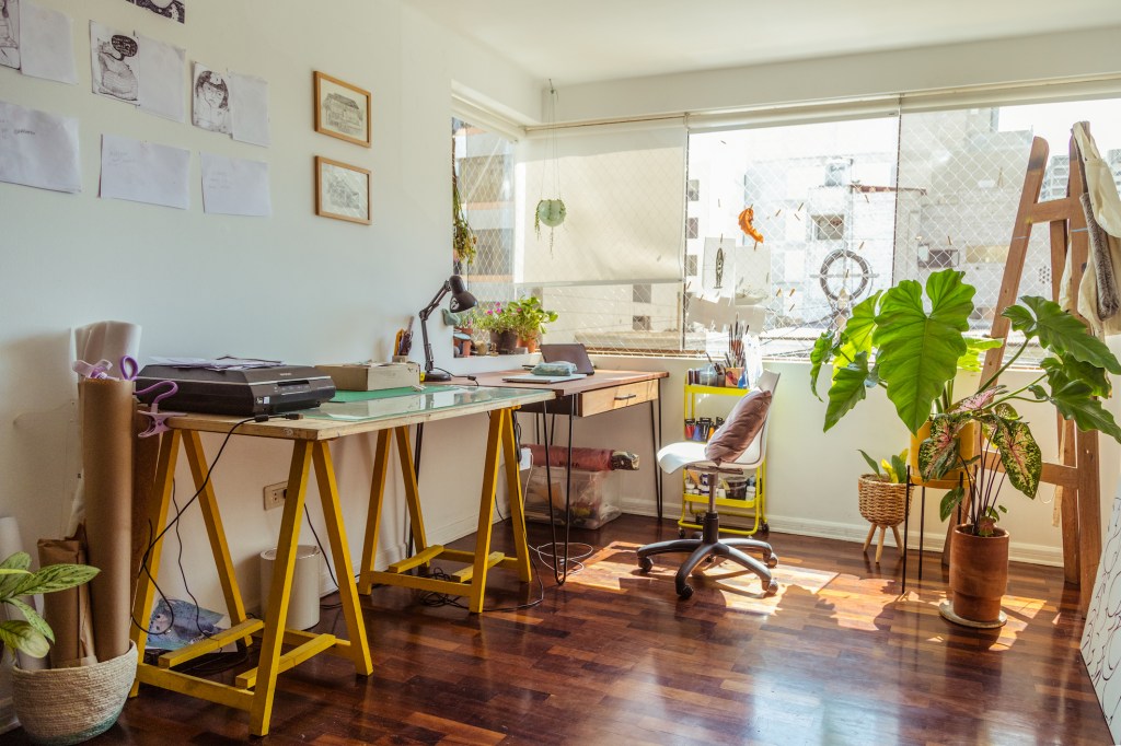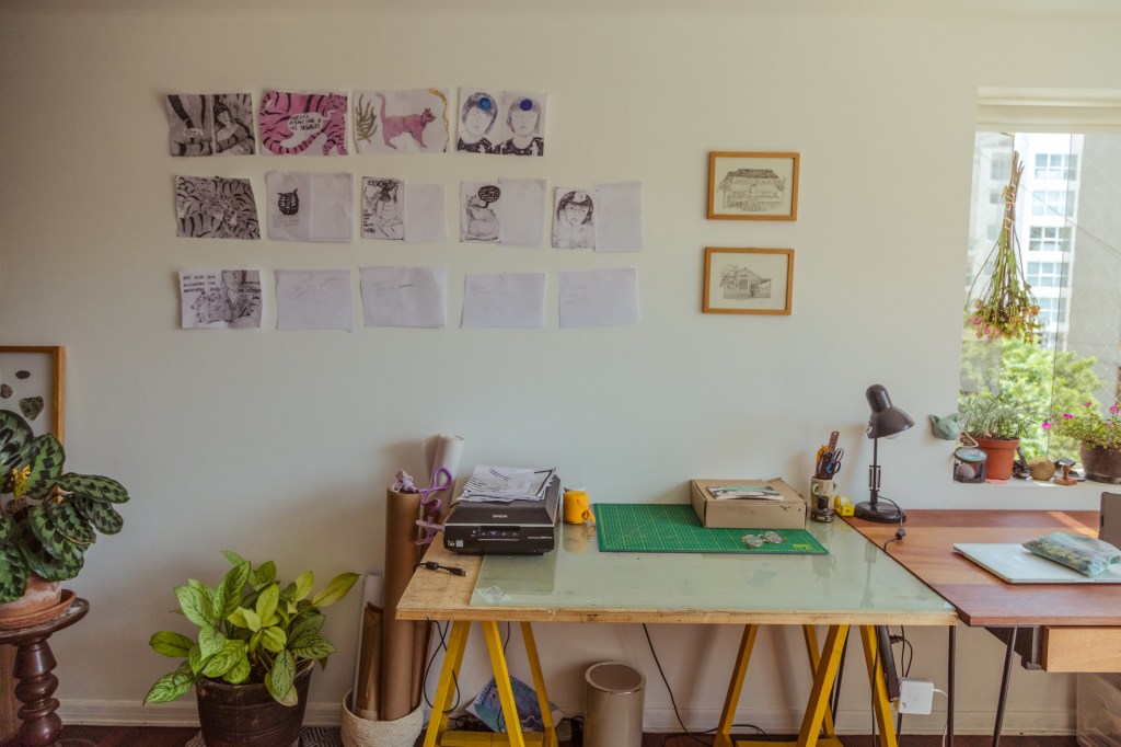 Casi siempre trabaja en su escritorio porque es más cómodo y tiene todo lo que necesita a la mano, pero a veces su cuerpo y su mente le piden moverse. Antes de la pandemia, parte de su rutina era instalarse en un café y quedarse ahí todo el día. Aquí en su depa a veces se distrae: está su gato, está su cama. Para variar un poco, cuando tiene que contestar mails se acomoda en la sala y si se abruma mucho, se va a cocinar. Últimamente sube al techo, donde hay un toldo y un par de sillas, y se quedo dibujando. Le gustaría poder tener siempre su taller en casa, pero sí que quisiera que sea más independiente, para poder dividir mejor los momentos en su día. Y claro, su sueño es tener un taller muy grande. Quizás en su próxima casa.