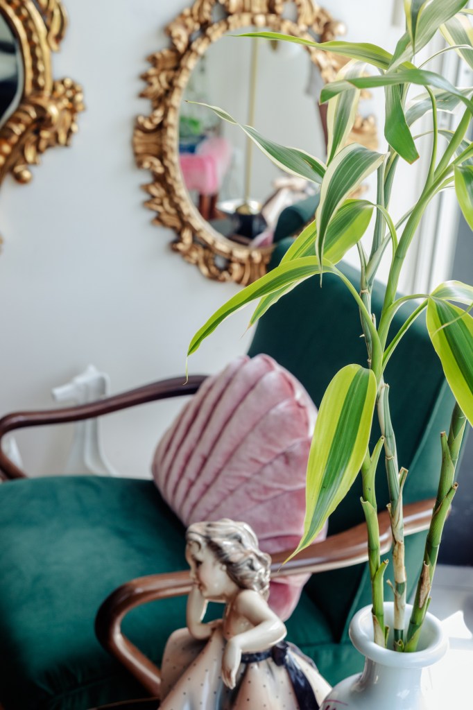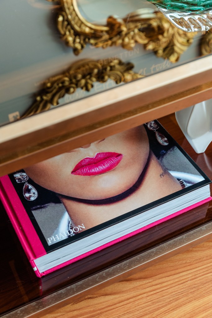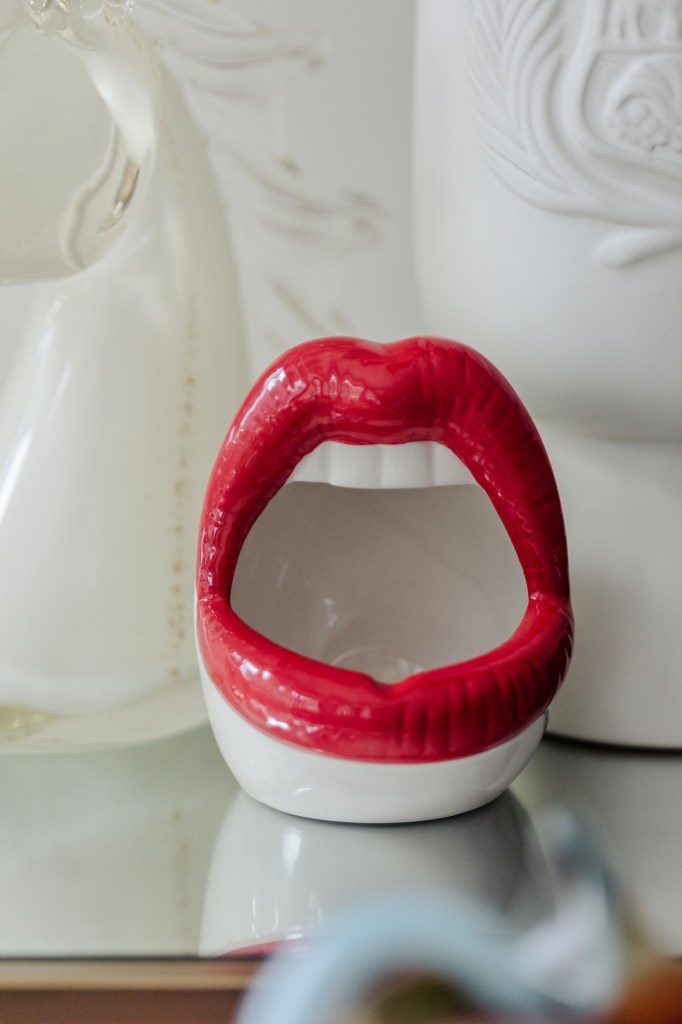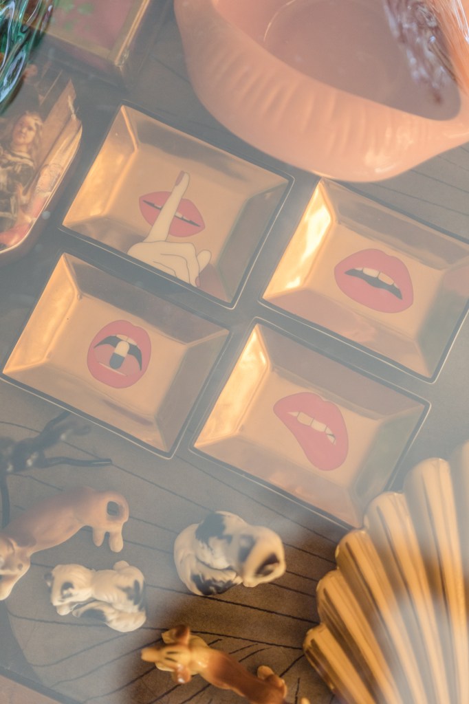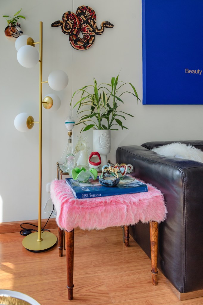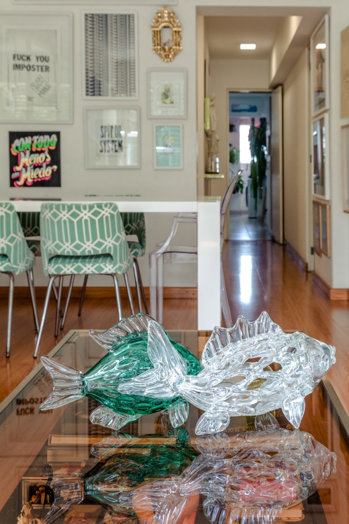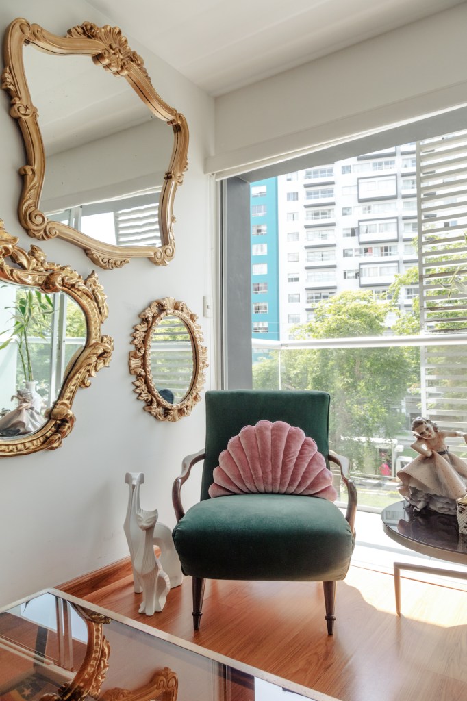 “Tengo claro que lo que ves en mi departamento no es la estética típica, puede que no a todo el mundo le guste, pero al final son ideas, son cosas que a mí, me inspiran. Mi casa me inspira”, comenta Milagros. Ha creado un ecosistema propicio para nutrir su creatividad y no dejarse paralizar por el miedo. Por eso, sus ambientes son expresivos, abundan en detalles y colores vivos. Mientras tanto, lo femenino toma absoluto protagonismo: se percibe en sus muñecas, los adornos de porcelana, los espejos con marco de pan de oro, las figuras de labios rojos reproduciéndose aquí y allá.
